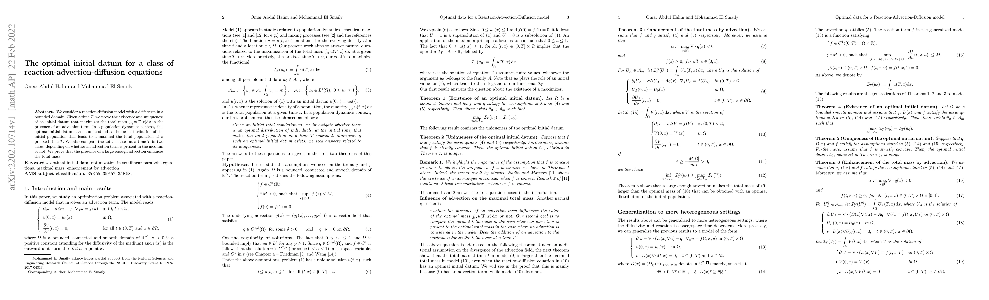 This paper proves the existence of an optimal initial datum for a reaction-advection-diffusion equation that maximizes population at time T, with advection enhancing total mass.