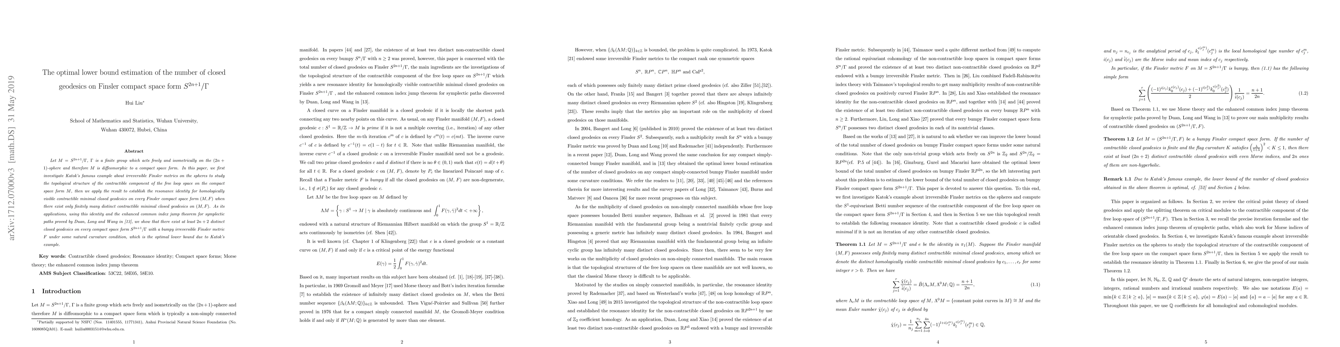 Let $M=S^{2n+1}/ \Gamma$, $\Gamma$ is a finite group which acts freely and isometrically on the $(2n+1)$-sphere and therefore $M$ is diffeomorphic to a compact space form. In this paper, we first investigate Katok's famous example about irreversible Finsler metrics on the spheres to study the topological structure of the contractible component of the free loop space on the compact space form $M$, then we apply the result to establish the resonance identity for homologically visible contractible minimal closed geodesics on every Finsler compact space form $(M, F)$ when there exist only finitely many distinct contractible minimal closed geodesics on $(M, F)$. As its applications, using this identity and the enhanced common index jump theorem for symplectic paths proved by Duan, Long and Wang in \cite{DLW2}, we show that there exist at least $2n+2$ distinct closed geodesics on every compact space form $S^{2n+1}/ \Gamma$ with a bumpy irreversible Finsler metric $F$ under some natural curvature condition, which is the optimal lower bound due to Katok's example.