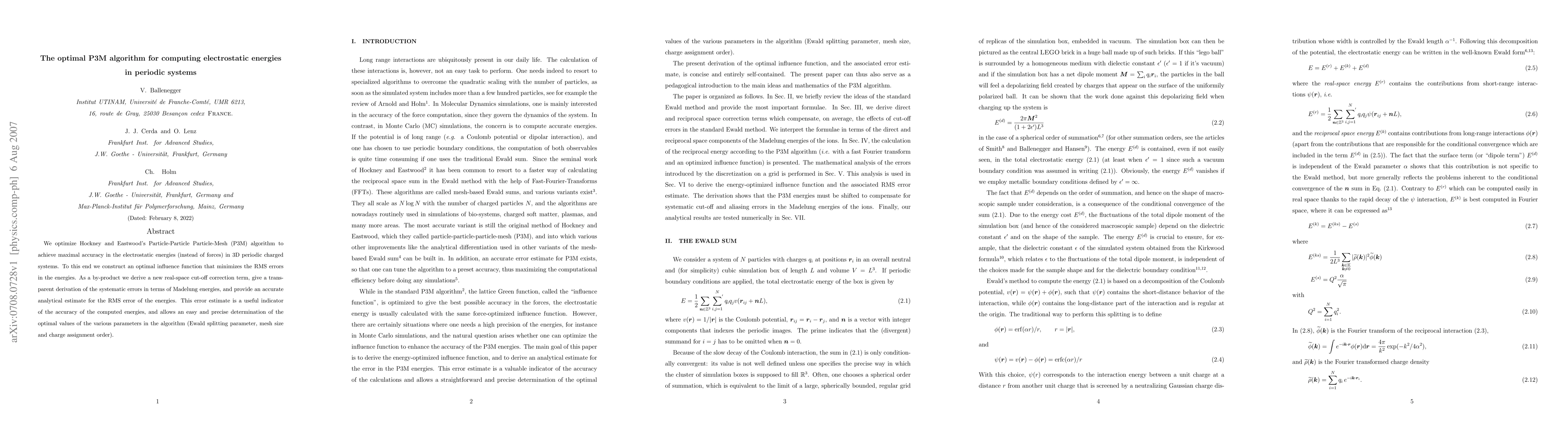 This paper optimizes Hockney and Eastwood's P3M algorithm for computing electrostatic energies in 3D periodic systems, introducing an optimal influence function to minimize RMS errors. It also provides a new real-space cut-off correction term, a transparent derivation of systematic errors, and an analytical estimate for RMS error to determine optimal algorithm parameters.