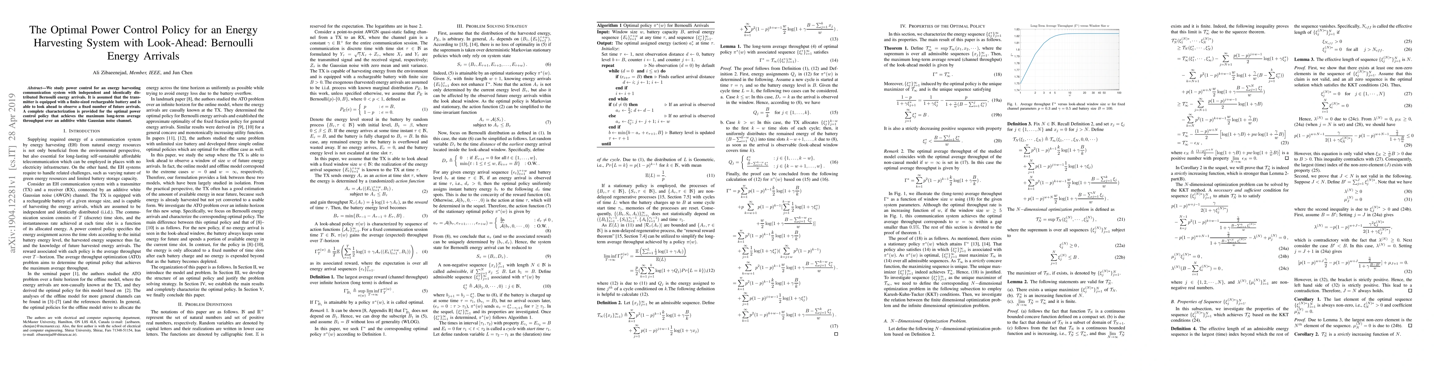 We study power control for an energy harvesting communication system with independent and identically distributed Bernoulli energy arrivals. It is assumed that the transmitter is equipped with a finite-sized rechargeable battery and is able to look ahead to observe a fixed number of future arrivals. A complete characterization is provided for the optimal power control policy that achieves the maximum long-term average throughput over an additive white Gaussian noise channel.