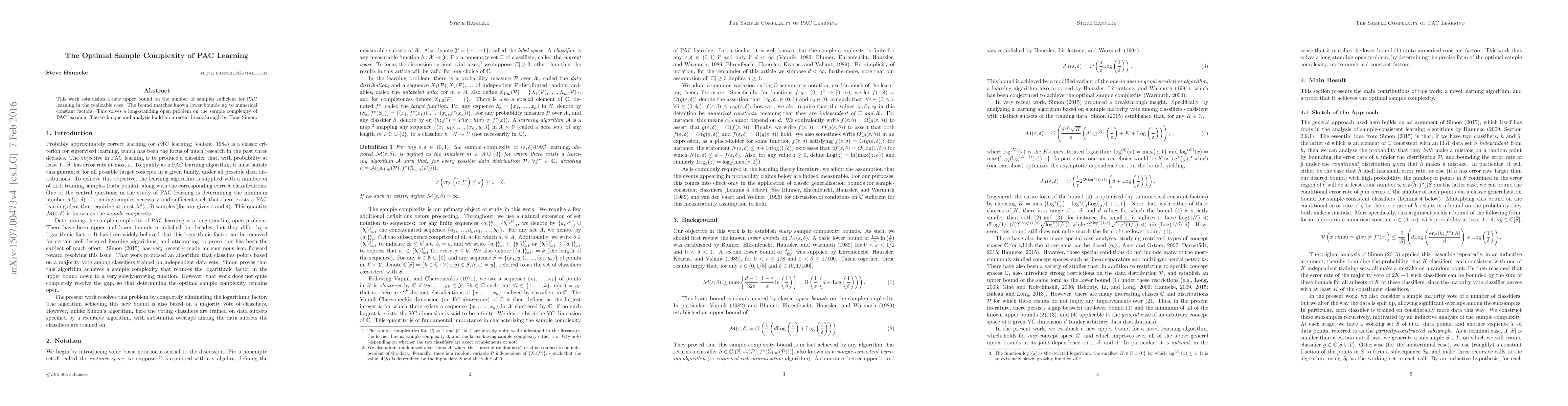 This work establishes a new upper bound on the number of samples sufficient for PAC learning in the realizable case. The bound matches known lower bounds up to numerical constant factors. This solves a long-standing open problem on the sample complexity of PAC learning. The technique and analysis build on a recent breakthrough by Hans Simon.