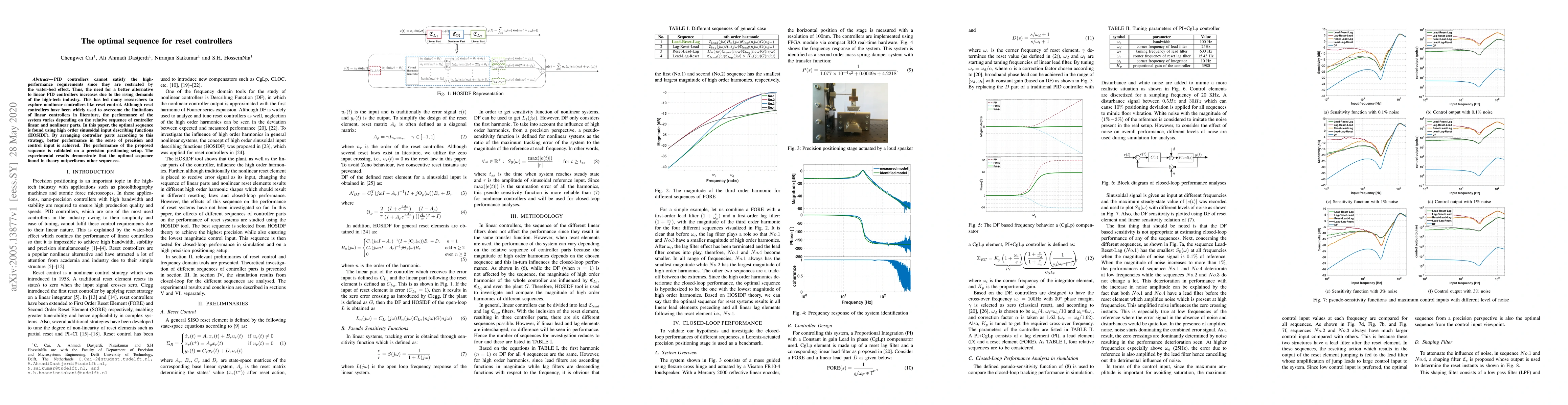 This paper investigates the optimal sequence for reset controllers to enhance performance over linear PID controllers, finding that the arrangement of controller parts significantly affects precision and control input. The optimal sequence is determined using high order sinusoidal input describing functions (HOSIDF), and experimental results on a precision positioning setup confirm its superior performance.