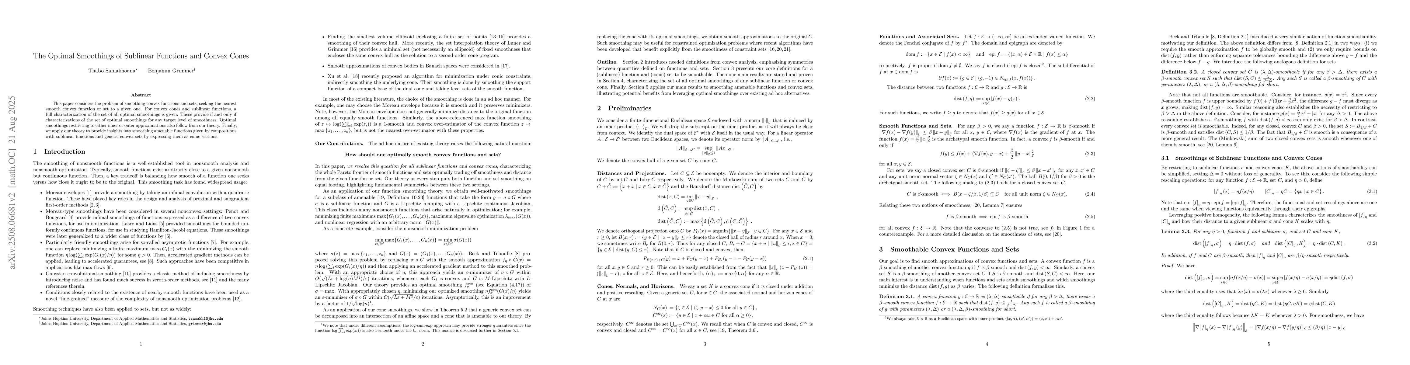 This paper considers the problem of smoothing convex functions and sets, seeking the nearest smooth convex function or set to a given one. For convex cones and sublinear functions, a full characterization of the set of all optimal smoothings is given. These provide if and only if characterizations of the set of optimal smoothings for any target level of smoothness. Optimal smoothings restricting to either inner or outer approximations also follow from our theory. Finally, we apply our theory to provide insights into smoothing amenable functions given by compositions with sublinear functions and generic convex sets by expressing them as conic sections.