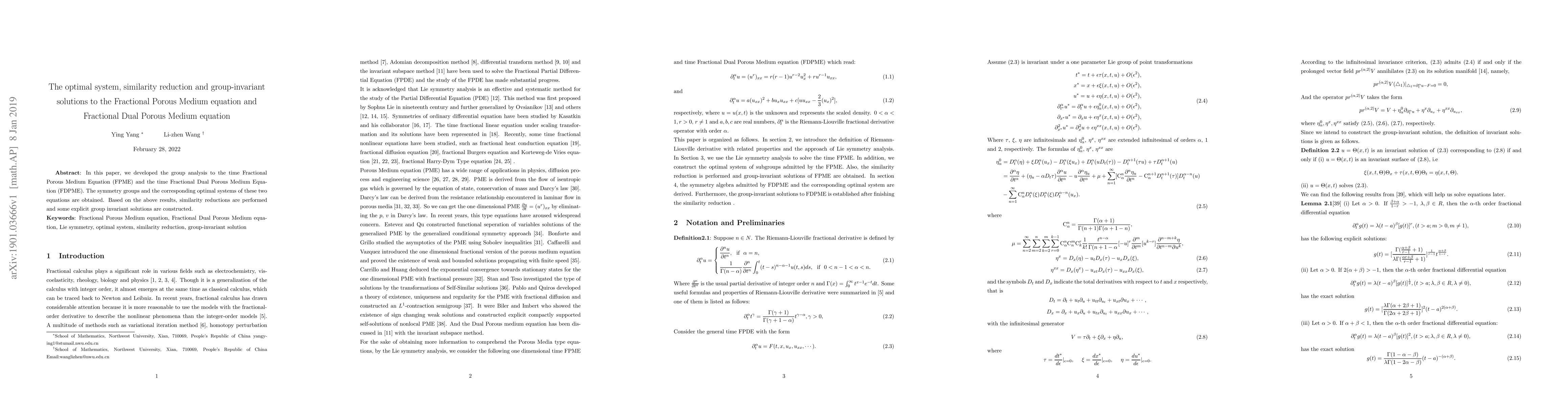 This paper utilizes group analysis to derive symmetry groups and optimal systems for the Fractional Porous Medium Equation and Fractional Dual Porous Medium Equation, followed by similarity reductions and construction of explicit group-invariant solutions.
