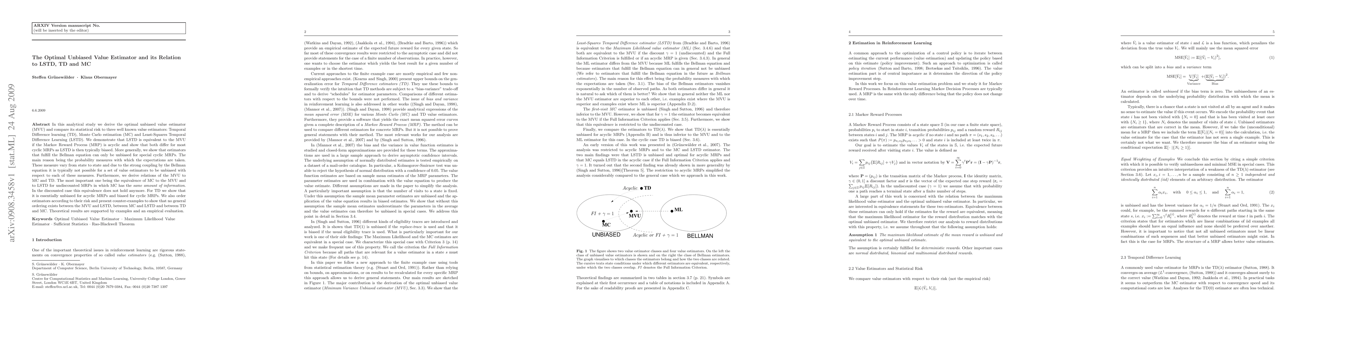 This paper derives the optimal unbiased value estimator (MVU) and compares its statistical risk to Temporal Difference learning (TD), Monte Carlo estimation (MC), and Least-Squares Temporal Difference Learning (LSTD). It shows that LSTD is equivalent to MVU for acyclic Markov Reward Processes but biased for cyclic ones, while MC is equivalent to MVU and LSTD for undiscounted MRPs.