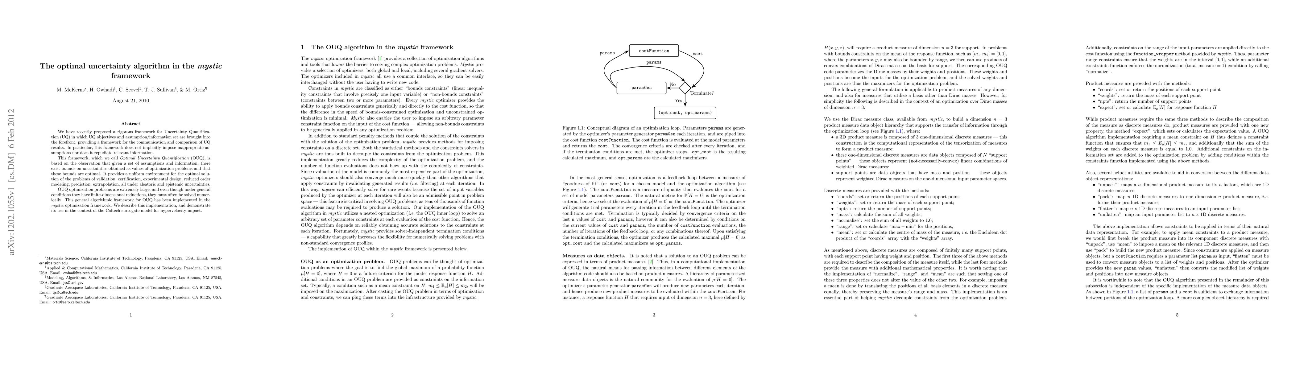 We have recently proposed a rigorous framework for Uncertainty Quantification (UQ) in which UQ objectives and assumption/information set are brought into the forefront, providing a framework for the communication and comparison of UQ results. In particular, this framework does not implicitly impose inappropriate assumptions nor does it repudiate relevant information. This framework, which we call Optimal Uncertainty Quantification (OUQ), is based on the observation that given a set of assumptions and information, there exist bounds on uncertainties obtained as values of optimization problems and that these bounds are optimal. It provides a uniform environment for the optimal solution of the problems of validation, certification, experimental design, reduced order modeling, prediction, extrapolation, all under aleatoric and epistemic uncertainties. OUQ optimization problems are extremely large, and even though under general conditions they have finite-dimensional reductions, they must often be solved numerically. This general algorithmic framework for OUQ has been implemented in the mystic optimization framework. We describe this implementation, and demonstrate its use in the context of the Caltech surrogate model for hypervelocity impact.