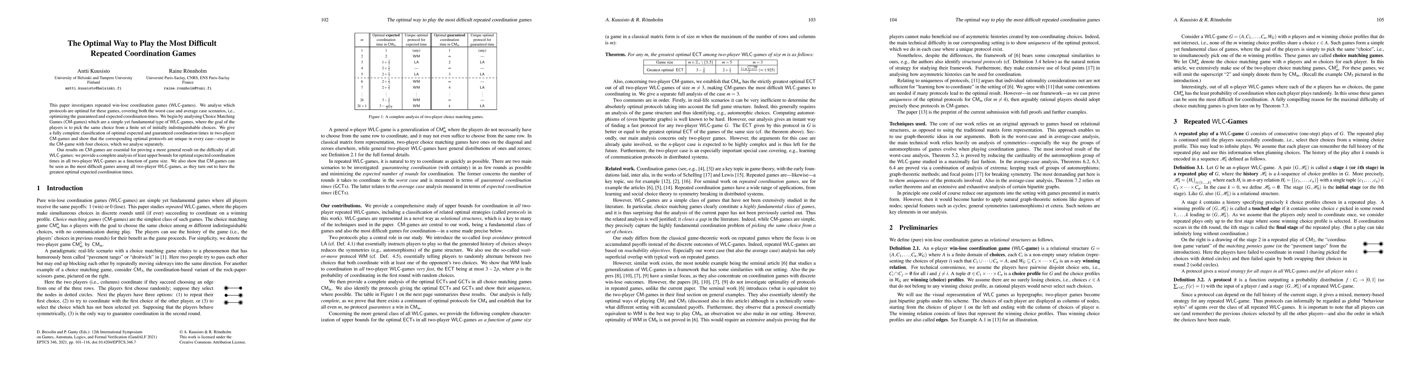 This paper classifies optimal protocols for repeated win-lose coordination games, focusing on Choice Matching Games (CM-games) and proving that they are the most difficult among two-player WLC-games due to their highest optimal expected coordination times. It provides a complete analysis of least upper bounds for optimal coordination times in all two-player WLC-games.