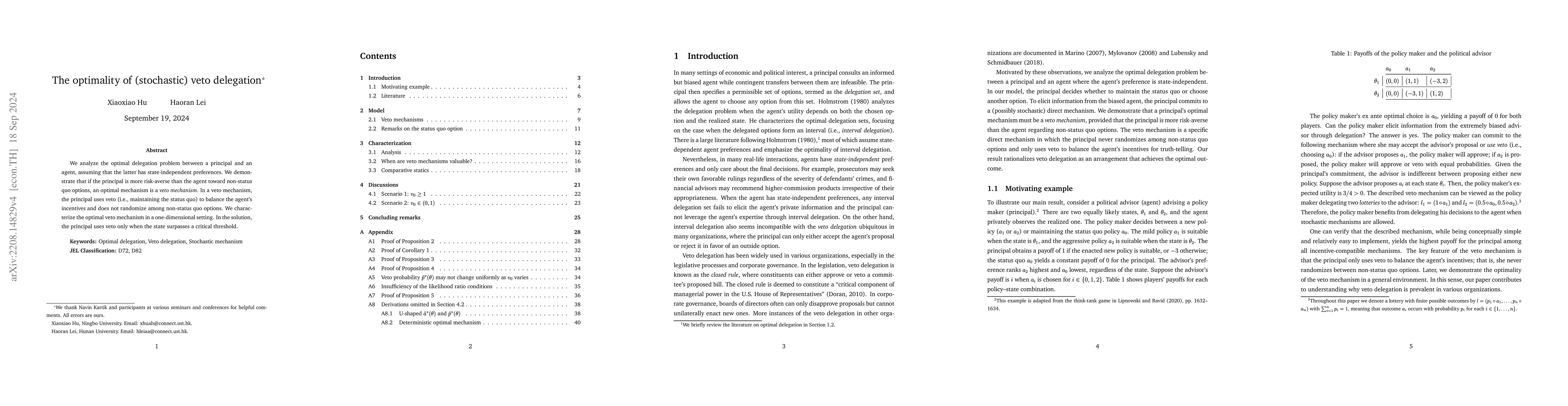 This paper explores optimal delegation between a risk-averse principal and a risk-neutral agent, showing that an optimal mechanism is a veto mechanism where the principal maintains the status quo to balance incentives, without randomizing among non-status quo options. The principal uses veto only when the state exceeds a critical threshold.