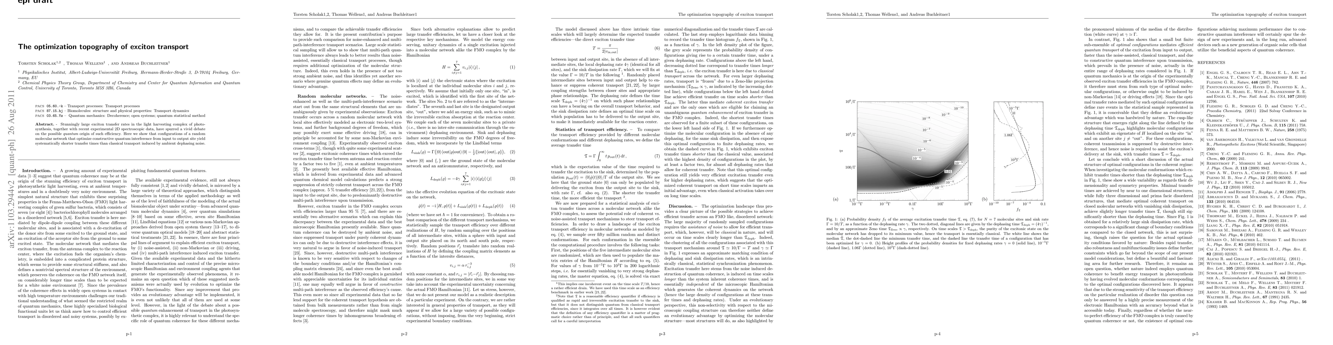 Stunningly large exciton transfer rates in the light harvesting complex of photosynthesis, together with recent experimental 2D spectroscopic data, have spurred a vivid debate on the possible quantum origin of such efficiency. Here we show that configurations of a random molecular network that optimize constructive quantum interference from input to output site yield systematically shorter transfer times than classical transport induced by ambient dephasing noise.
