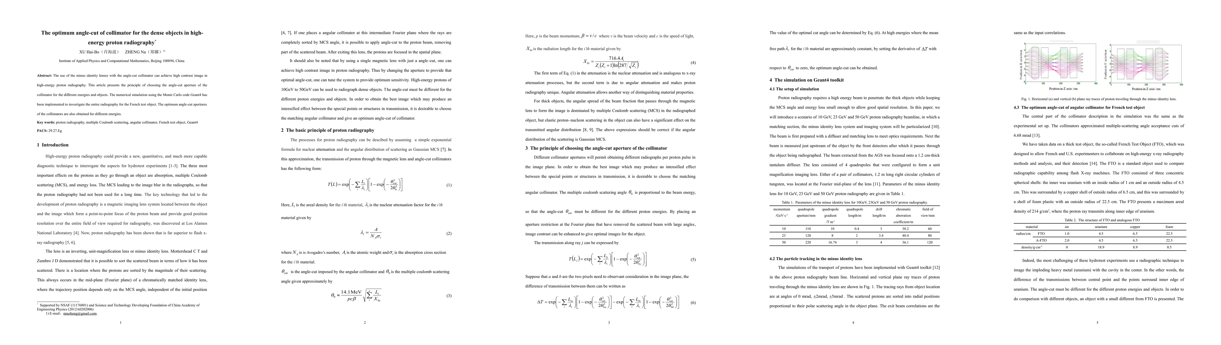 This paper explores the optimal angle-cut of collimators for high-energy proton radiography using minus identity lenses, achieving high contrast images. Numerical simulations with Geant4 reveal the best angle-cut apertures for various energies and dense objects.