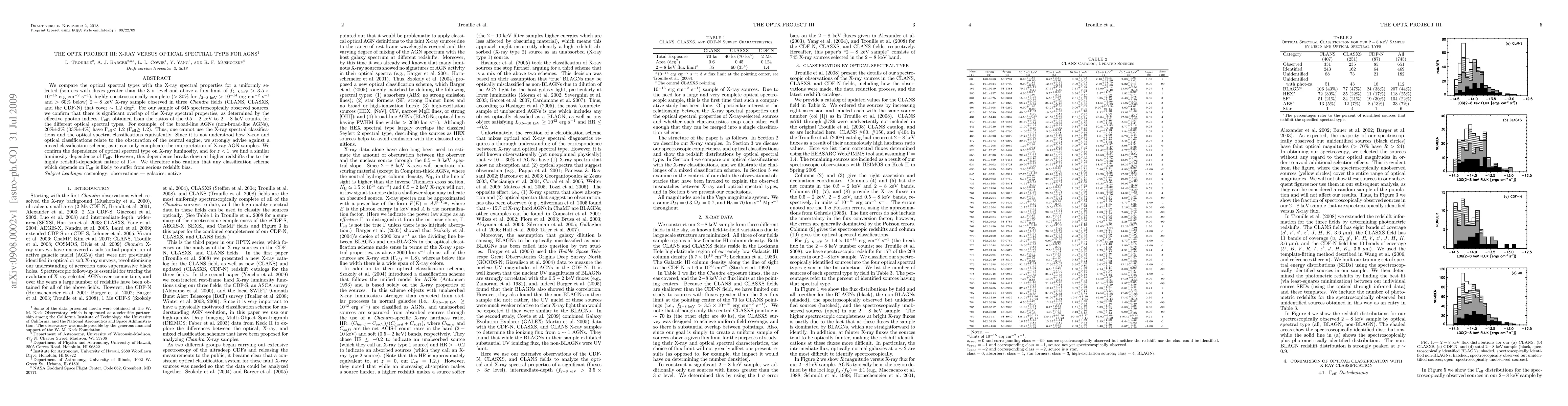 We compare the optical spectral types with the X-ray spectral properties for a uniformly selected (sources with fluxes greater than the 3 sigma level and above a flux limit of f_2-8 keV > 3.5x10^-15 erg/cm2/s), highly spectroscopically complete (>80% for f_2-8 keV > 10^-14 erg/cm2/s and >60% below) 2-8 keV X-ray sample observed in three Chandra fields (CLANS, CLASXS, and the CDF-N) that cover ~1.2 deg^2. For our sample of 645 spectroscopically observed sources, we confirm that there is significant overlap of the X-ray spectral properties, as determined by the effective photon indices, Geff, obtained from the ratios of the 0.5-2 keV to 2-8 keV counts, for the different optical spectral types. For example, of the broad-line AGNs (non-broad-line AGNs), 20% +/- 3% (33% +/- 4%) have Geff<1.2 (Geff > 1.2). Thus, one cannot use the X-ray spectral classifications and the optical spectral classifications equivalently. Since it is not understood how X-ray and optical classifications relate to the obscuration of the central engine, we strongly advise against a mixed classification scheme, as it can only complicate the interpretation of X-ray AGN samples. We confirm the dependence of optical spectral type on X-ray luminosity, and for z<1, we find a similar luminosity dependence of Geff. However, this dependence breaks down at higher redshifts due to the highly redshift-dependent nature of Geff. We therefore also caution that any classification scheme which depends on Geff is likely to suffer from serious redshift bias.