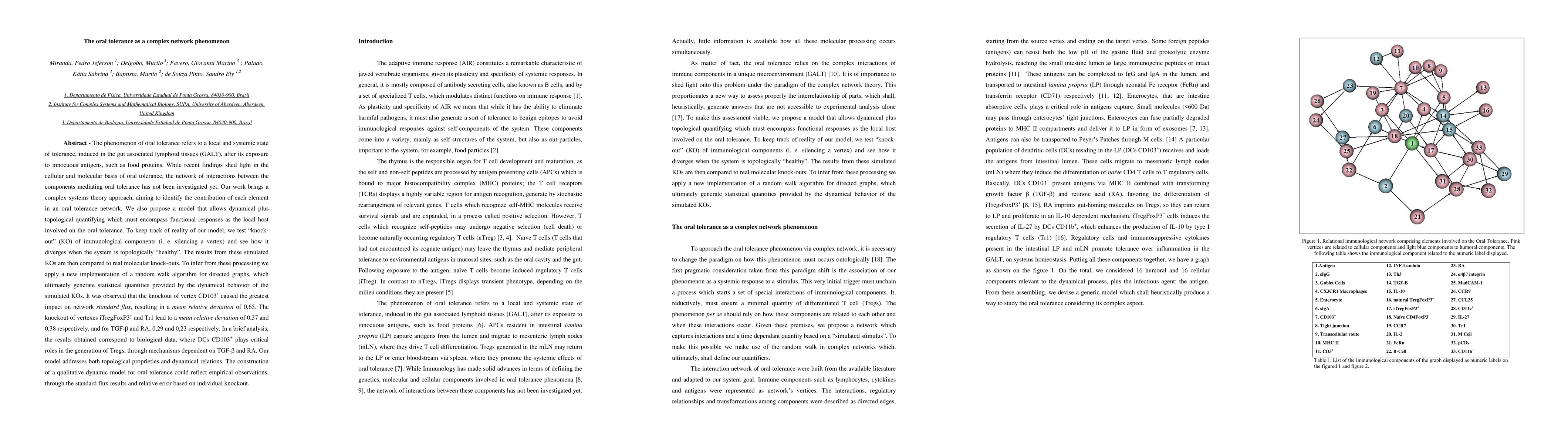 Researchers investigated oral tolerance using a complex systems theory approach, finding that specific immunological components can have significant impacts on the network's functioning. Their model demonstrates topological properties and dynamical relations in oral tolerance networks.
