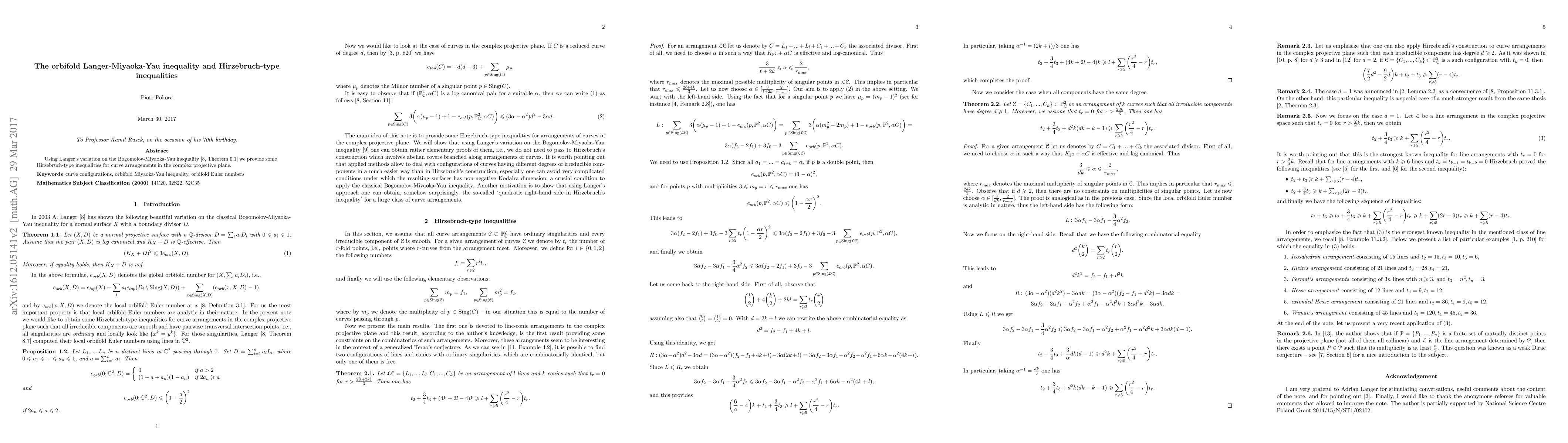This paper establishes Hirzebruch-type inequalities for curve arrangements in the complex projective plane using Langer's variation of the Bogomolov-Miyaoka-Yau inequality. The results extend the orbifold Langer-Miyaoka-Yau inequality to this geometric context.