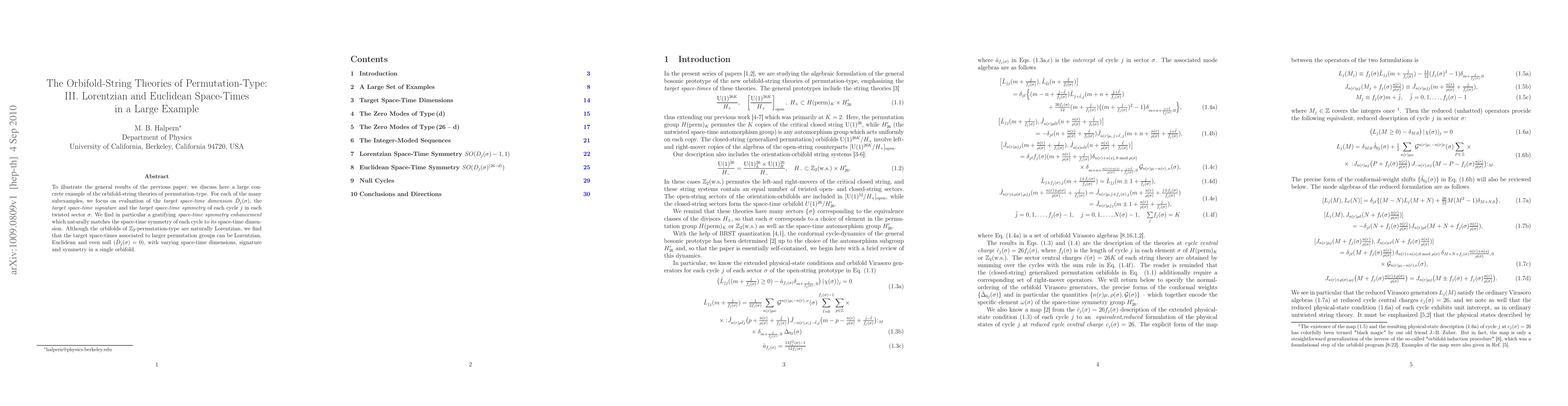 To illustrate the general results of the previous paper, we discuss here a large concrete example of the orbifold-string theories of permutation-type. For each of the many subexamples, we focus on evaluation of the \emph{target space-time dimension} $\hat{D}_j(\sigma)$, the \emph{target space-time signature} and the \emph{target space-time symmetry} of each cycle $j$ in each twisted sector $\sigma$. We find in particular a gratifying \emph{space-time symmetry enhancement} which naturally matches the space-time symmetry of each cycle to its space-time dimension. Although the orbifolds of $\Z_{2}$-permutation-type are naturally Lorentzian, we find that the target space-times associated to larger permutation groups can be Lorentzian, Euclidean and even null (\hat{D}_{j}(\sigma)=0), with varying space-time dimensions, signature and symmetry in a single orbifold.