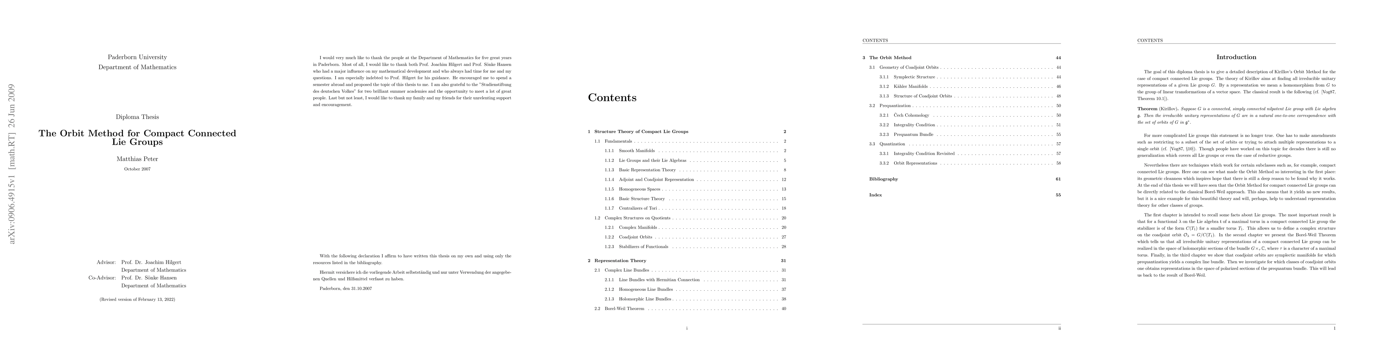 This paper provides a detailed exposition of Kirillov's Orbit Method for compact connected Lie groups, focusing on finding irreducible unitary representations. It explores coadjoint orbits, their symplectic structures, and the realization of representations via holomorphic sections of associated bundles, culminating in the Borel-Weil Theorem.