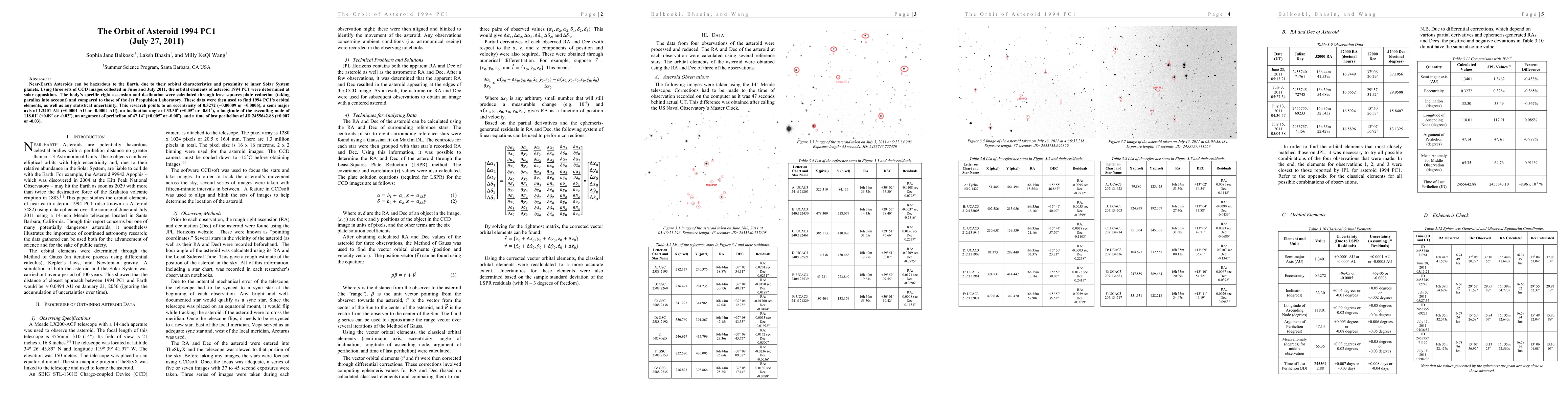 Near-Earth Asteroids can be hazardous to the Earth, due to their orbital characteristics and proximity to inner Solar System planets. Using three sets of CCD images collected in June and July 2011, the orbital elements of asteroid 1994 PC1 were determined at solar opposition. The body's specific right ascension and declination were calculated through least squares plate reduction (taking parallax into account) and compared to those of the Jet Propulsion Laboratory. These data were then used to find 1994 PC1's orbital elements, as well as any statistical uncertainty. This research points to an eccentricity of 0.3272 (+0.00009 or -0.0005), a semi major axis of 1.3401 AU (+0.0001 AU or -0.0004 AU), an inclination angle of 33.30^{\circ} (+0.05^{\circ} or -0.01^{\circ}), a longitude of the ascending node of 118.01^{\circ} (+0.09^{\circ} or -0.02^{\circ}), an argument of perihelion of 47.14^{\circ} (+0.005^{\circ} or -0.08^{\circ}), and a time of last perihelion of JD 2455642.88 (+0.007 or -0.03).
