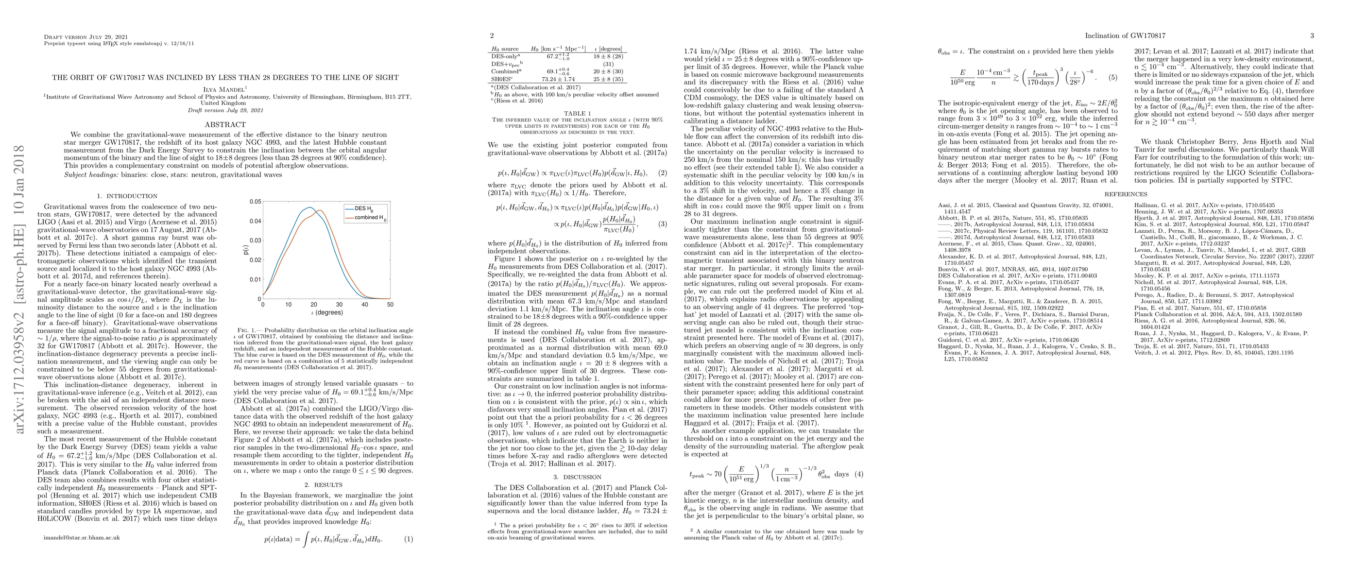 We combine the gravitational-wave measurement of the effective distance to the binary neutron star merger GW170817, the redshift of its host galaxy NGC 4993, and the latest Hubble constant measurement from the Dark Energy Survey to constrain the inclination between the orbital angular momentum of the binary and the line of sight to $18 \pm 8$ degrees (less than 28 degrees at 90% confidence). This provides a complementary constraint on models of potential afterglow observations.