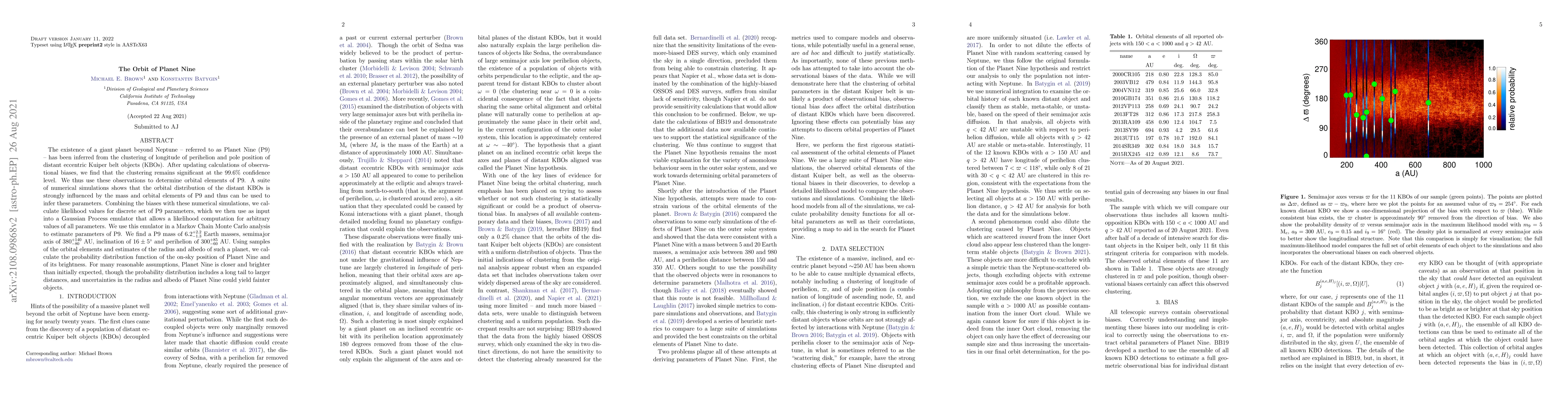 The existence of a giant planet beyond Neptune -- referred to as Planet Nine (P9) -- has been inferred from the clustering of longitude of perihelion and pole position of distant eccentric Kuiper belt objects (KBOs). After updating calculations of observational biases, we find that the clustering remains significant at the 99.6\% confidence level. We thus use these observations to determine orbital elements of P9. A suite of numerical simulations shows that the orbital distribution of the distant KBOs is strongly influenced by the mass and orbital elements of P9 and thus can be used to infer these parameters. Combining the biases with these numerical simulations, we calculate likelihood values for discrete set of P9 parameters, which we then use as input into a Gaussian Process emulator that allows a likelihood computation for arbitrary values of all parameters. We use this emulator in a Markov Chain Monte Carlo analysis to estimate parameters of P9. We find a P9 mass of $6.2^{+2.2}_{-1.3}$ Earth masses, semimajor axis of $380^{+140}_{-80}$ AU, inclination of $16\pm5^\circ$ and perihelion of $300^{+85}_{-60}$ AU. Using samples of the orbital elements and estimates of the radius and albedo of such a planet, we calculate the probability distribution function of the on-sky position of Planet Nine and of its brightness. For many reasonable assumptions, Planet Nine is closer and brighter than initially expected, though the probability distribution includes a long tail to larger distances, and uncertainties in the radius and albedo of Planet Nine could yield fainter objects.