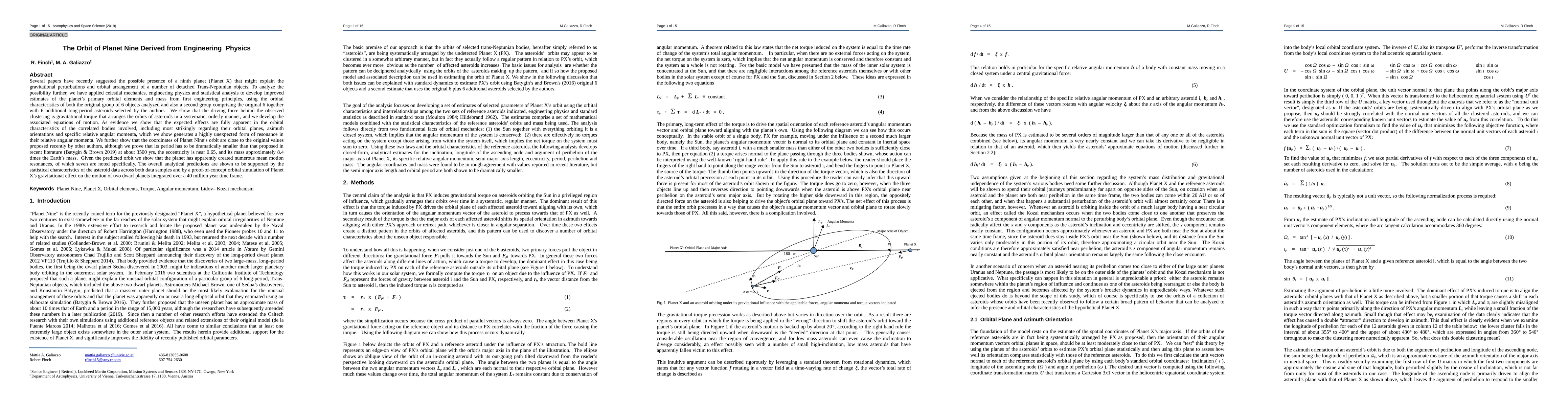 Several papers have recently suggested the possible presence of a ninth planet (Planet X) that might explain the gravitational perturbations of a number of detached Trans-Neptunian objects. To analyze the possibility further, we have applied celestial mechanics, engineering physics and statistical analysis to develop improved estimates of the planet's primary orbital elements and mass from first engineering principles, using the orbital characteristics of both the original group of 6 objects analyzed and also a second group comprising the original 6 together with 6 additional long-period asteroids selected by the authors. We show that the driving force behind the observed clustering is gravitational torque that arranges the orbits of asteroids in a systematic, orderly manner, and we develop the associated equations of motion. As evidence we show that the expected effects are fully apparent in the orbital characteristics of the correlated bodies involved, including most strikingly regarding their orbital planes, azimuth orientations and specific relative angular momenta, which we show generates a highly unexpected form of resonance in their relative angular momenta. We further show that the coordinates of Planet 9's orbit are close to the original values proposed recently by other authors, although we prove that its period has to be dramatically smaller than that proposed in recent literature by Batygin and Brown, 2019, at about 3500 yrs, the eccentricity is near 0.65, and its mass approximately 8.4 times the Earth's mass. Given the predicted orbit we show that the planet has apparently created numerous mean motion resonances, of which seven are noted specifically. As for a possible observation, Planet X, would range between V=18.9 and 26.1, probably with a magnitude of about 24.8.