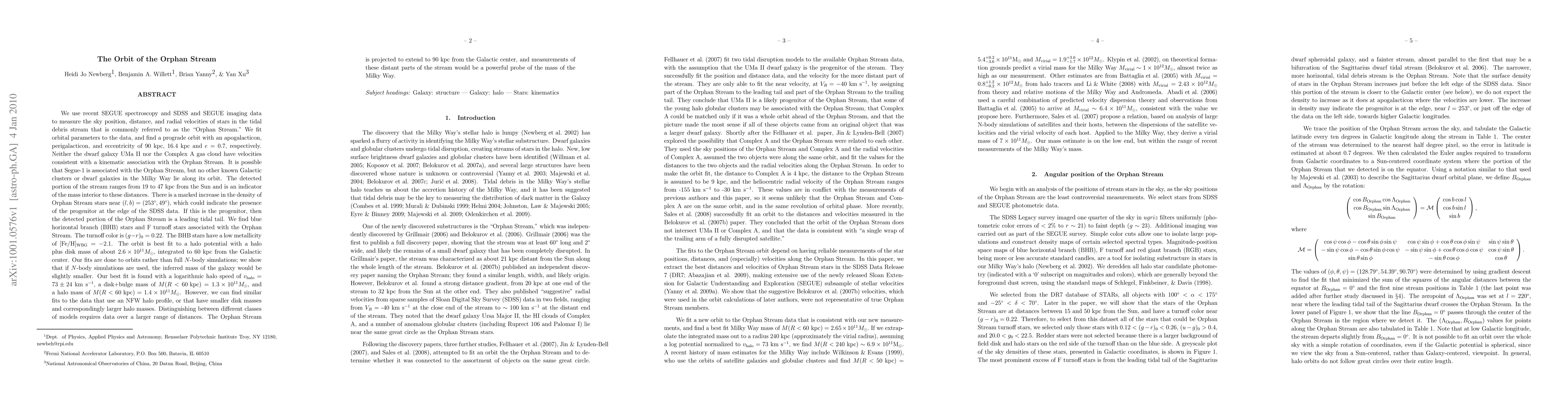 This paper analyzes the Orphan Stream's orbit using SEGUE and SDSS data, finding a prograde orbit extending to 90 kpc with a low metallicity. The stream's mass and potential suggest a Milky Way halo plus disk mass of 2.6x10^11 Solar masses.