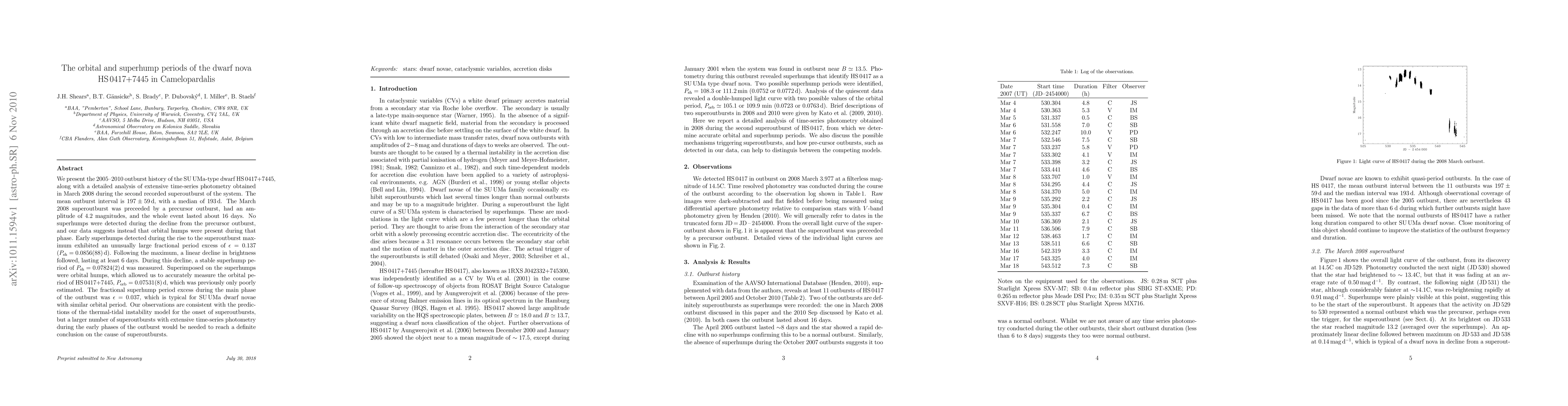 We present the 2005-2010 outburst history of the SUUMa-type dwarf HS 0417+7445,along with a detailed analysis of extensive time-series photometry obtained in March 2008 during the second recorded superoutburst of the system. The mean outburst interval is 197 \pm 59 d, with a median of 193 d. The March 2008 superoutburst was preceeded by a precursor outburst, had an amplitude of 4.2 magnitudes, and the whole event lasted about 16 days. No superhumps were detected during the decline from the precursor outburst, and our data suggests instead that orbital humps were present during that phase. Early superhumps detected during the rise to the superoutburst maximum exhibited an unusually large fractional period excess of epsilon = 0.137 (Psh = 0.0856(88) d). Following the maximum, a linear decline in brightness followed, lasting at least 6 days. During this decline, a stable superhump period of Psh = 0.07824(2) d was measured. Superimposed on the superhumps were orbital humps, which allowed us to accurately measure the orbital period of HS 0417+7445, Porb = 0.07531(8) d, which was previously only poorly estimated. The fractional superhump period excess during the main phase of the outburst was epsilon = 0.037, which is typical for SU UMa dwarf novae with similar orbital period. Our observations are consistent with the predictions of the thermal-tidal instability model for the onset of superoutbursts,but a larger number of superoutbursts with extensive time-series photometry during the early phases of the outburst would be needed to reach a definite conclusion on the cause of superoutbursts.