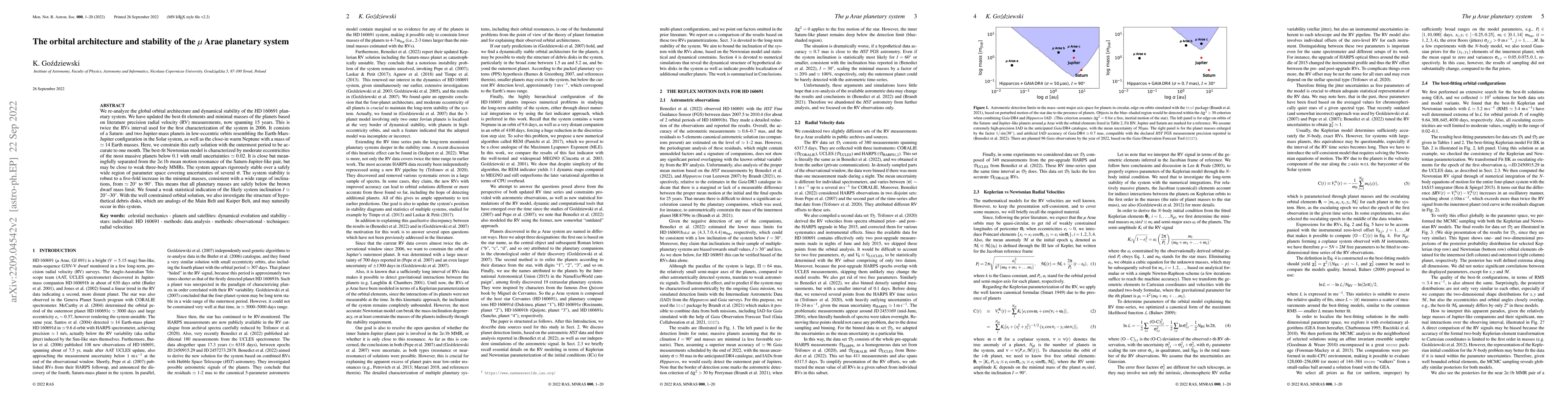 This study re-analyzes the orbital architecture and stability of the $\mu$ Arae planetary system, revealing a configuration of Saturn- and two Jupiter-mass planets with low eccentricities. The system's stability is robust over a wide parameter space, suggesting all planetary masses are below the brown dwarf threshold, with a likely inclination of 20-30 degrees.