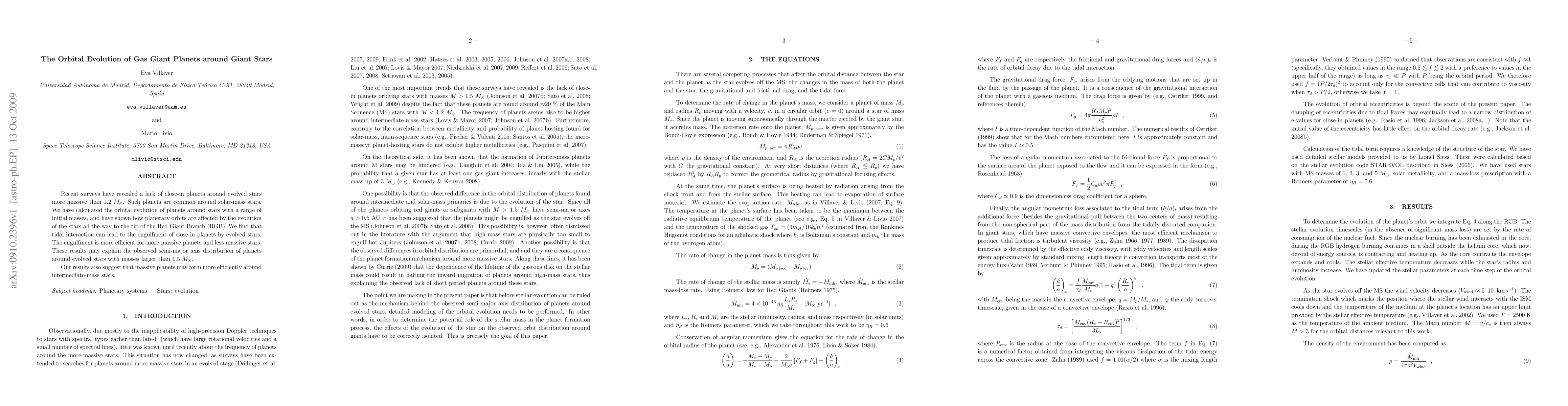 This study investigates the orbital evolution of gas giant planets around giant stars, revealing that tidal interactions can lead to the engulfment of close-in planets by evolved stars, especially for more-massive planets and less-massive stars. These findings may explain the observed scarcity of close-in planets around evolved stars more massive than 1.5 Msun.