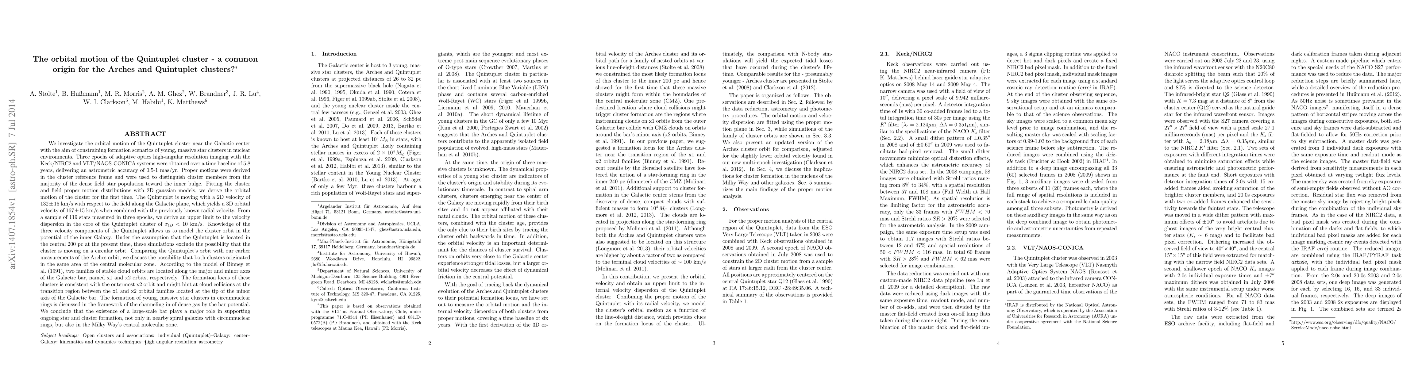 This research derives the orbital motion of the Quintuplet star cluster near the Galactic center, finding it moves at 167 km/s. Comparing this with the Arches cluster's orbit, the study suggests both may have originated from the same region in the central molecular zone.