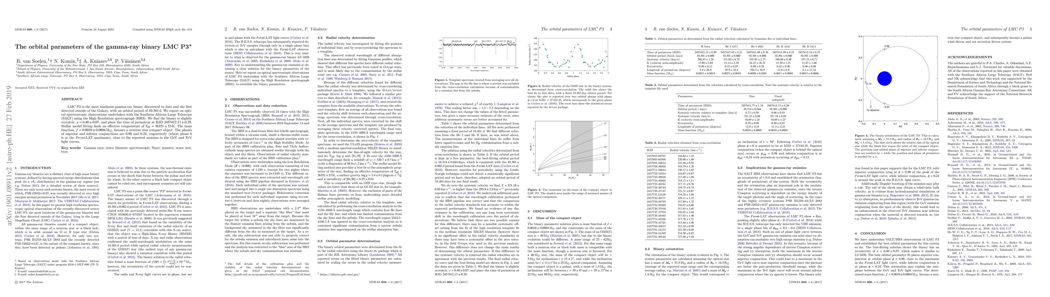 This paper reports on the orbital parameters of the luminous gamma-ray binary LMC P3, discovered outside the Galaxy, with an orbital period of 10.301 days. Optical spectroscopic observations reveal a slightly eccentric orbit, a time of periastron, and suggest a neutron star compact object based on the mass function.