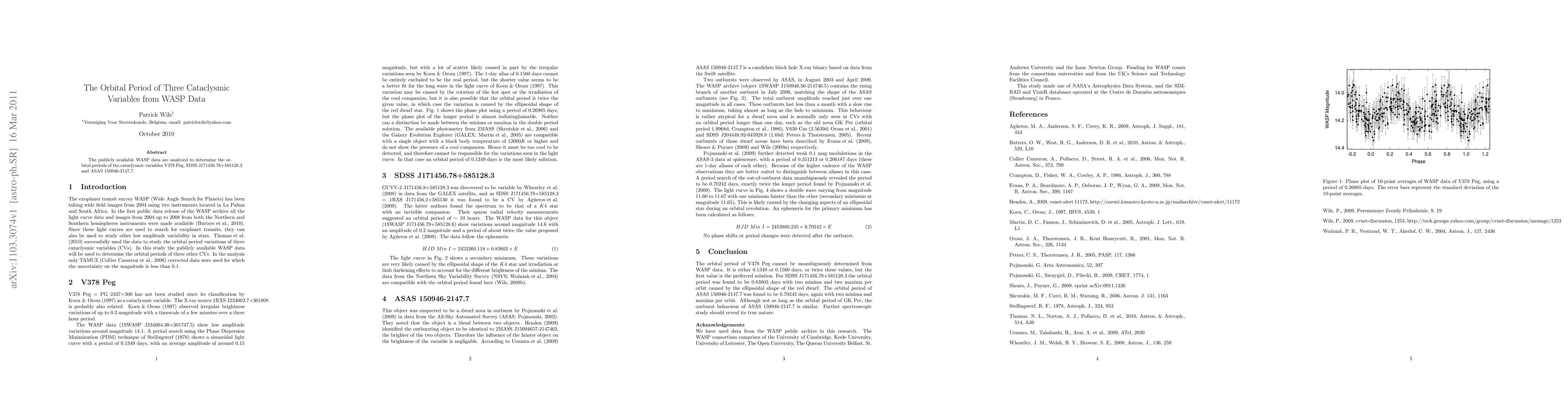 The research analyzes publicly available WASP data to determine the orbital periods of three cataclysmic variables: V378 Peg, SDSS J171456.78+585128.3, and ASAS 150946-2147.7.
