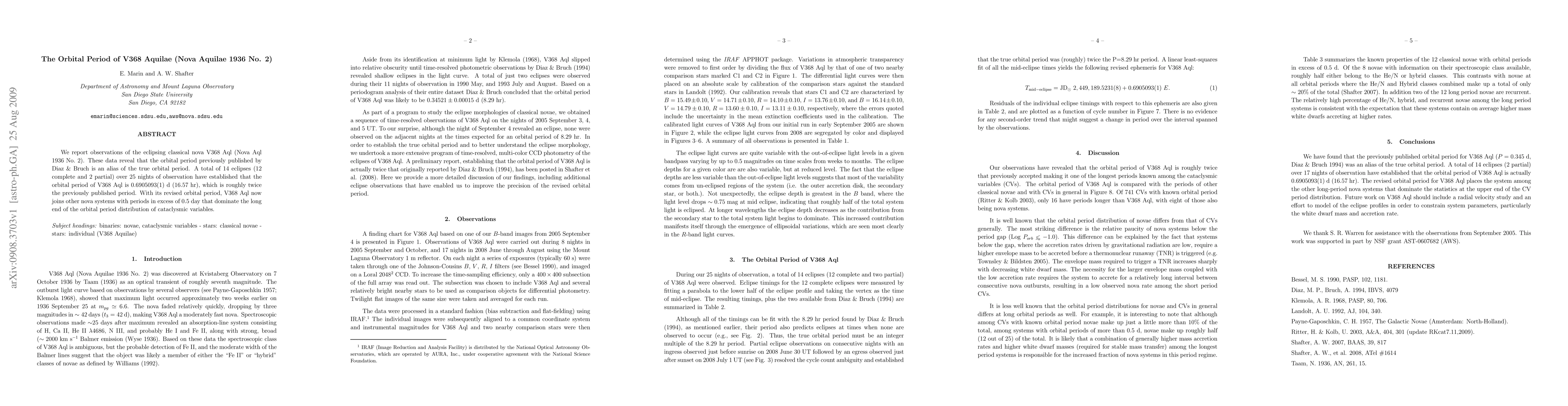 We report observations of the eclipsing classical nova V368 Aql (Nova Aql 1936 No. 2). These data reveal that the orbital period previously published by Diaz & Bruch is an alias of the true orbital period. A total of 14 eclipses (12 complete and 2 partial) over 25 nights of observation have established that the orbital period of V368 Aql is 0.6905093(1) d (16.57 hr), which is roughly twice the previously published period. With its revised orbital period, V368 Aql now joins other nova systems with periods in excess of 0.5 day that dominate the long end of the orbital period distribution of cataclysmic variables.