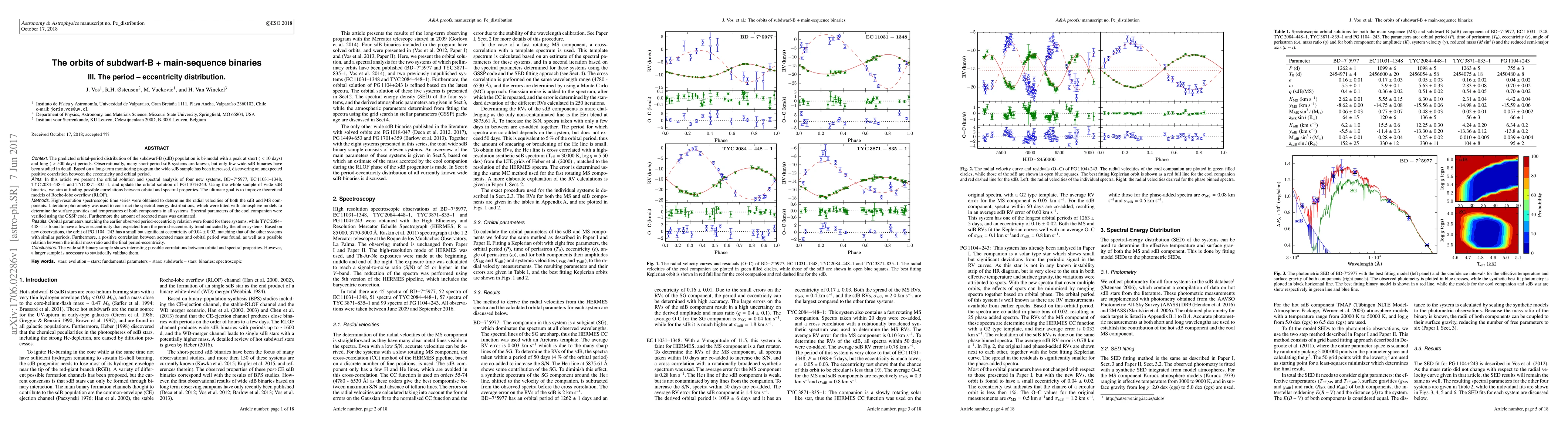 This paper investigates the period-eccentricity distribution of subdwarf-B (sdB) + main-sequence binaries, revealing unexpected correlations and presenting new orbital solutions for four systems. It finds a correlation between accreted mass and orbital period, suggesting possible links between initial mass-ratio and final period-eccentricity, though larger samples are needed for statistical validation.