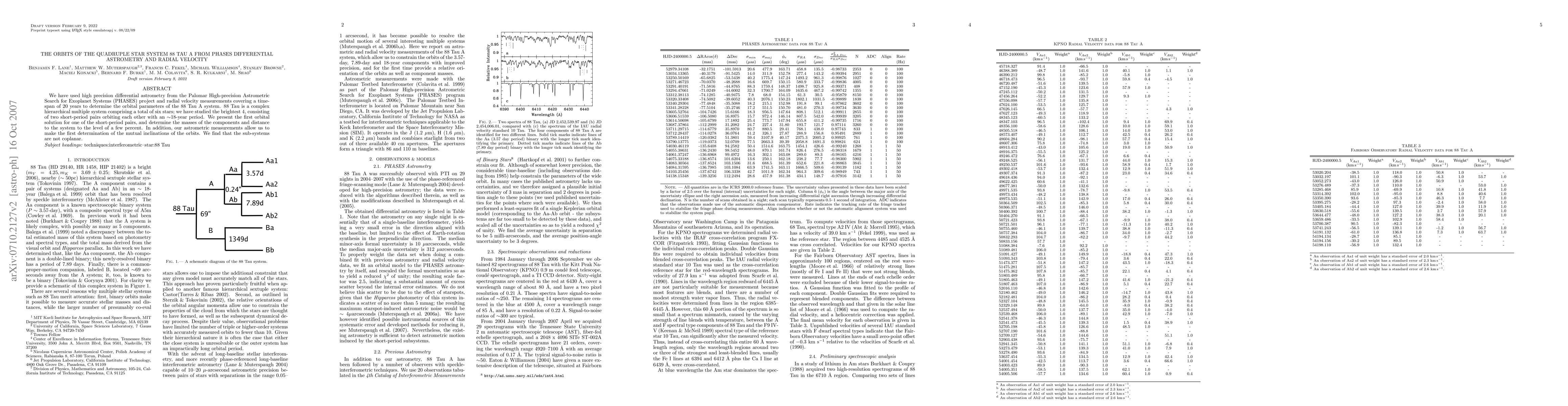 We have used high precision differential astrometry from the Palomar High-precision Astrometric Search for Exoplanet Systems (PHASES) project and radial velocity measurements covering a time-span of 20 years to determine the orbital parameters of the 88 Tau A system. 88 Tau is a complex hierarchical multiple system comprising a total of six stars; we have studied the brightest 4, consisting of two short-period pairs orbiting each other with an 18-year period. We present the first orbital solution for one of the short-period pairs, and determine the masses of the components and distance to the system to the level of a few percent. In addition, our astrometric measurements allow us to make the first determination of the mutual inclinations of the orbits. We find that the sub-systems are not coplanar.