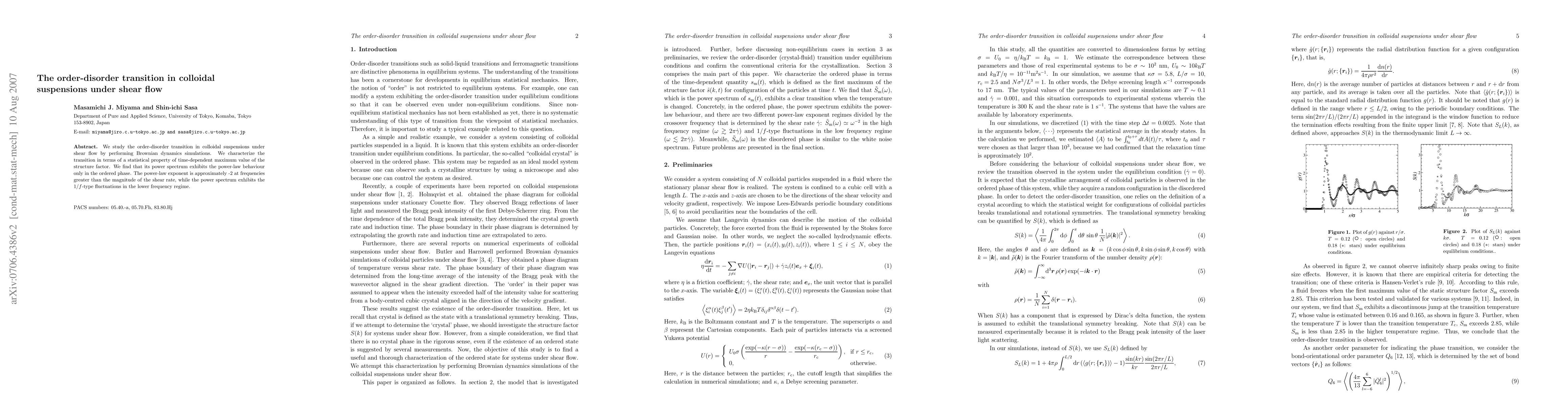 This paper explores the order-disorder transition in colloidal suspensions under shear flow using Brownian dynamics simulations, revealing a power-law behavior in the power spectrum of the structure factor's maximum value, specifically a -2 exponent at high frequencies, indicative of the ordered phase.