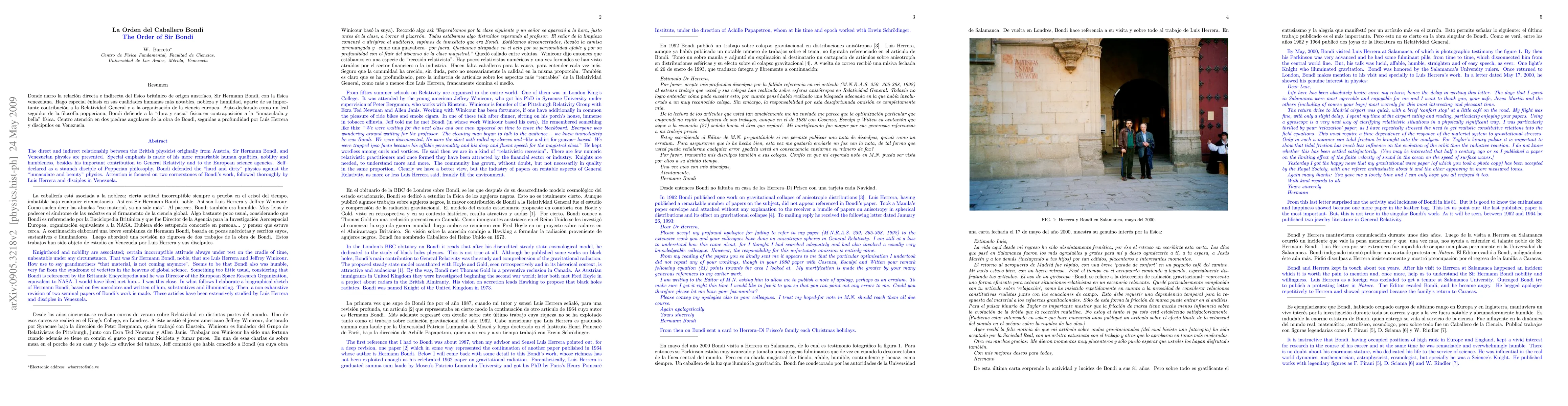 The direct and indirect relationship between the British physicist originally from Austria, Sir Hermann Bondi, and Venezuelan physics are presented. Special emphasis is made of his more remarkable human qualities, nobility and humbleness, besides his important contribution to General Relativity and to the European science agencies. Self--declared as a staunch disciple of Popperian philosophy, Bondi defended the "hard and dirty" physics against the "inmaculate and beauty" physics. Attention is focused on two cornerstones of Bondi's work, followed thoroughly by Luis Herrera and disciples in Venezuela.
