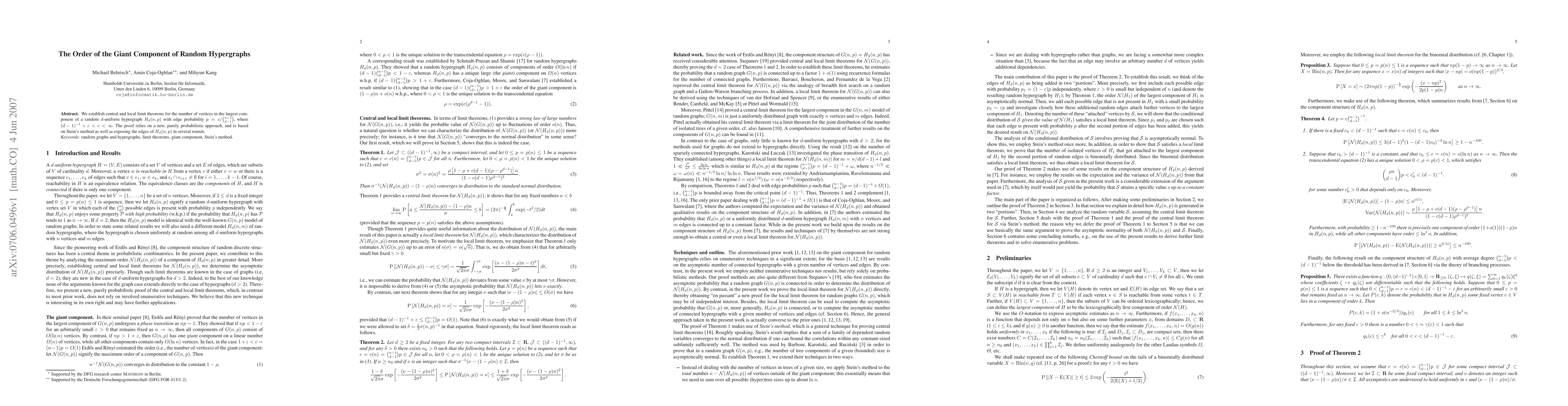 the largest component of a random $d$-uniform hypergraph $\hnp$ with edge