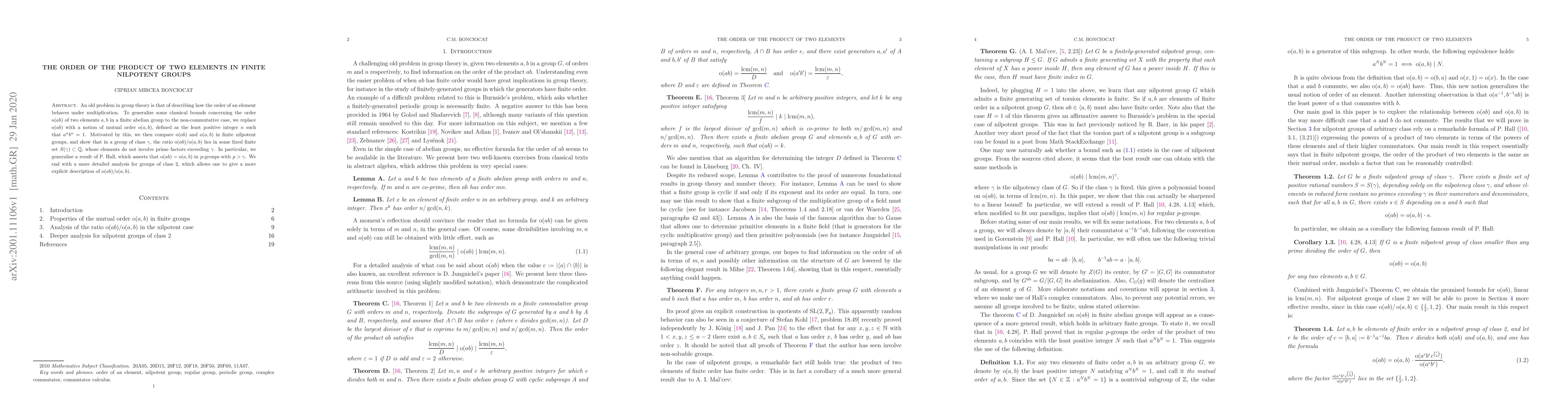 This research investigates the order of element products in finite nilpotent groups, introducing the concept of 'mutual order' o(a, b) as the smallest n for which a^n b^n equals the identity. It shows that in a group of class gamma, the ratio o(ab)/o(a, b) is confined to a finite set S(gamma), free of prime factors beyond gamma. The study also extends a previous result of P. Hall, proving o(ab) = o(a, b) for p-groups when p > gamma, with a detailed analysis for class 2 groups providing a more explicit description of o(ab)/o(a, b).