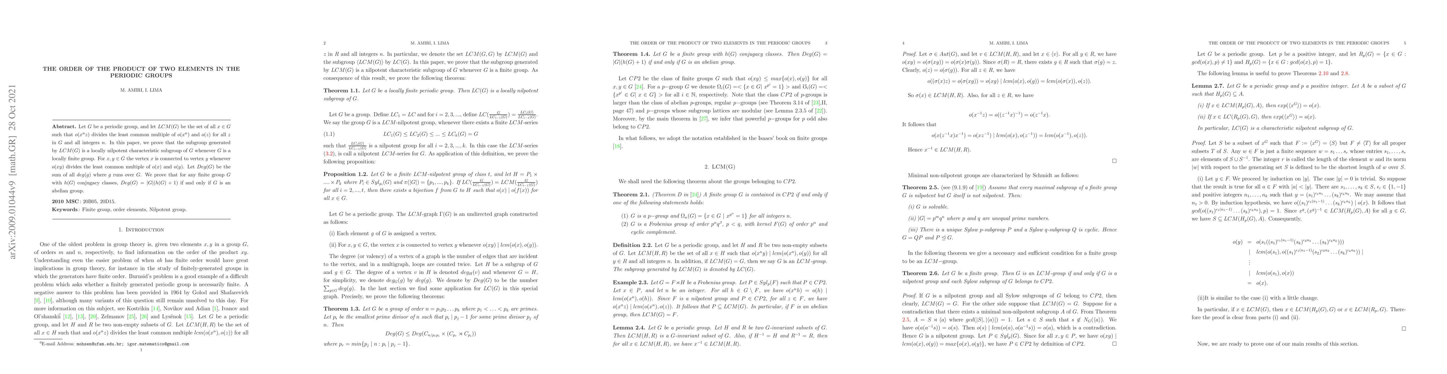 Let $G$ be a periodic group, and let $LCM(G)$ be the set of all $x\in G$ such that $o(x^nz)$ divides the least common multiple of $o(x^n)$ and $o(z)$ for all $z$ in $G$ and all integers $n$. In this paper, we prove that the subgroup generated by $LCM(G)$ is a locally nilpotent characteristic subgroup of $G$ whenever $G$ is a locally finite group. For $x,y\in G$ the vertex $x$ is connected to vertex $y$ whenever $o(xy)$ divides the least common multiple of $o(x)$ and $o(y)$. Let $Deg(G)$ be the sum of all $deg(g)$ where $g$ runs over $G$. We prove that for any finite group $G$ with $h(G)$ conjugacy classes, $Deg(G)=|G|(h(G)+1)$ if and only if $G$ is an abelian group.
