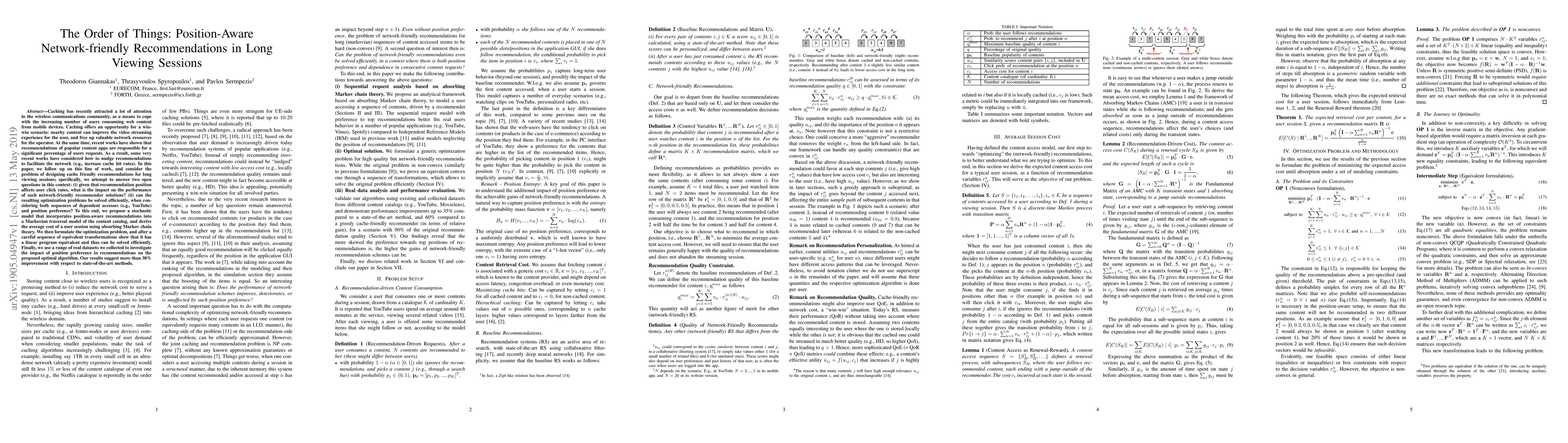 Caching has recently attracted a lot of attention in the wireless communications community, as a means to cope with the increasing number of users consuming web content from mobile devices. Caching offers an opportunity for a win-win scenario: nearby content can improve the video streaming experience for the user, and free up valuable network resources for the operator. At the same time, recent works have shown that recommendations of popular content apps are responsible for a significant percentage of users requests. As a result, some very recent works have considered how to nudge recommendations to facilitate the network (e.g., increase cache hit rates). In this paper, we follow up on this line of work, and consider the problem of designing cache friendly recommendations for long viewing sessions; specifically, we attempt to answer two open questions in this context: (i) given that recommendation position affects user click rates, what is the impact on the performance of such network-friendly recommender solutions? (ii) can the resulting optimization problems be solved efficiently, when considering both sequences of dependent accesses (e.g., YouTube) and position preference? To this end, we propose a stochastic model that incorporates position-aware recommendations into a Markovian traversal model of the content catalog, and derive the average cost of a user session using absorbing Markov chain theory. We then formulate the optimization problem, and after a careful sequence of equivalent transformations show that it has a linear program equivalent and thus can be solved efficiently. Finally, we use a range of real datasets we collected to investigate the impact of position preference in recommendations on the proposed optimal algorithm. Our results suggest more than 30\% improvement with respect to state-of-the-art methods.