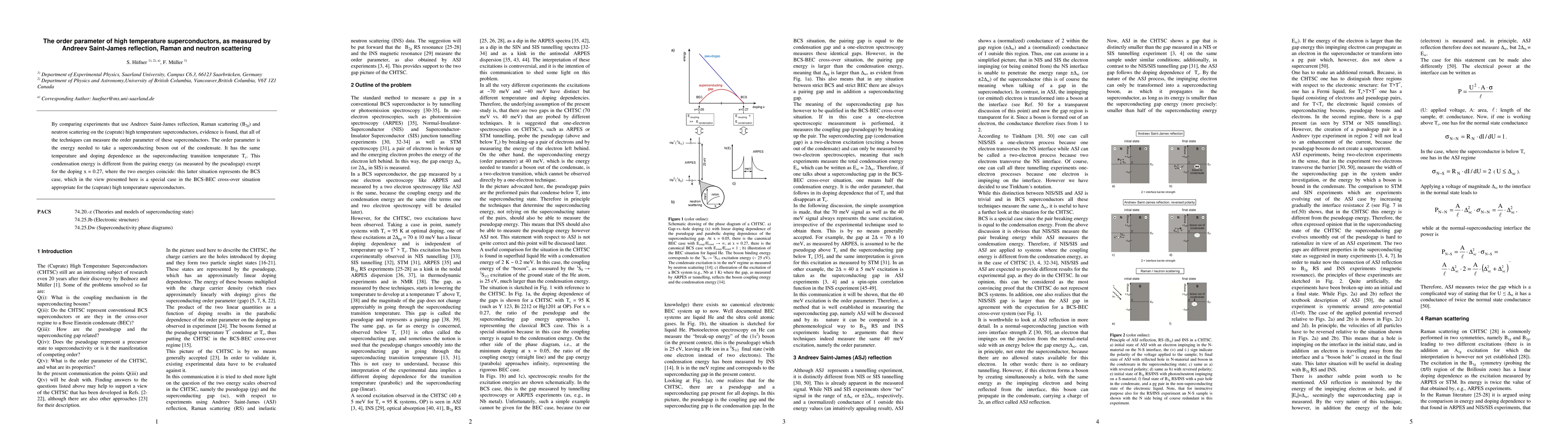 By comparing experiments that use Andreev Saint-James reflection, Raman scattering (B2g) and neutron scattering on the (cuprate) high temperature superconductors, evidence is found, that all of the techniques can measure the order parameter of these superconductors. The order parameter is the energy needed to take a superconducting boson out of the condensate. It has the same temperature and doping dependence as the superconducting transition temperature Tc. This condensation energy is different from the pairing energy (as measured by the pseudogap) except for the doping x = 0.27, where the two energies coincide: this latter situation represents the BCS case, which in the view presented here is a special case in the BCS-BEC cross-over situation appropriate for the (cuprate) high temperature superconductors.