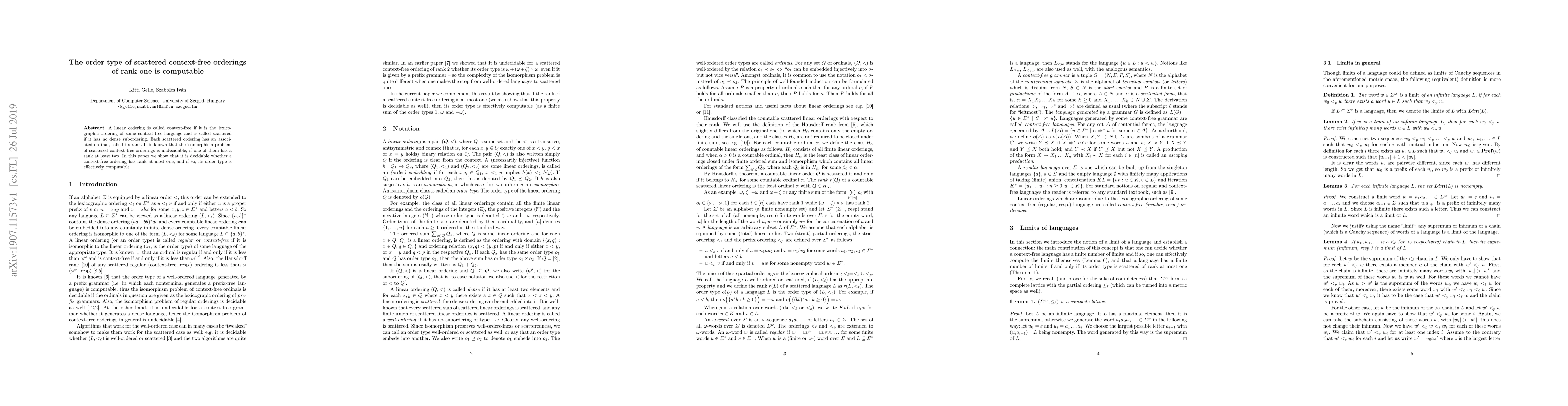 A linear ordering is called context-free if it is the lexicographic ordering of some context-free language and is called scattered if it has no dense subordering. Each scattered ordering has an associated ordinal, called its rank. It is known that the isomorphism problem of scattered context-free orderings is undecidable, if one of them has a rank at least two. In this paper we show that it is decidable whether a context-free ordering has rank at most one, and if so, its order type is effectively computable.