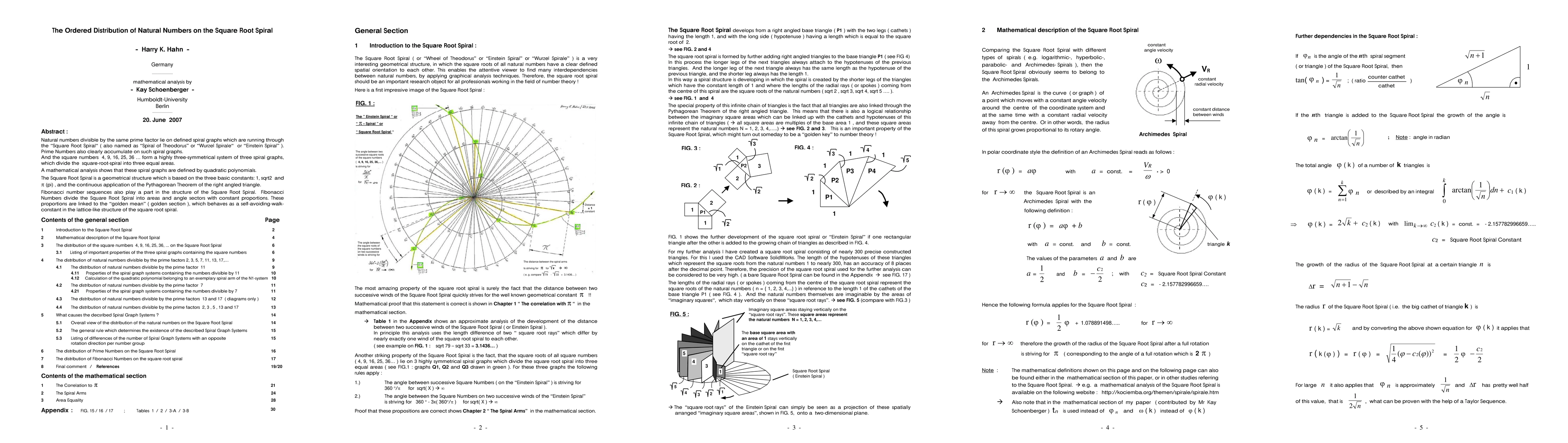 Natural numbers divisible by the same prime factor lie on defined spiral graphs which are running through the Square Root Spiral (also named as the Spiral of Theodorus or Wurzel Spirale or Einstein Spiral). Prime Numbers also clearly accumulate on such spiral graphs. And the square numbers 4, 9, 16, 25, 36,... form a highly three-symmetrical system of three spiral graphs, which divides the square-root-spiral into three equal areas. A mathematical analysis shows that these spiral graphs are defined by quadratic polynomials. Fibonacci number sequences also play a part in the structure of the Square Root Spiral. Fibonacci Numbers divide the Square Root Spiral into areas and angle sectors with constant proportions. These proportions are linked to the golden mean (or golden section), which behaves as a self-avoiding-walk-constant in the lattice-like structure of the square root spiral.
