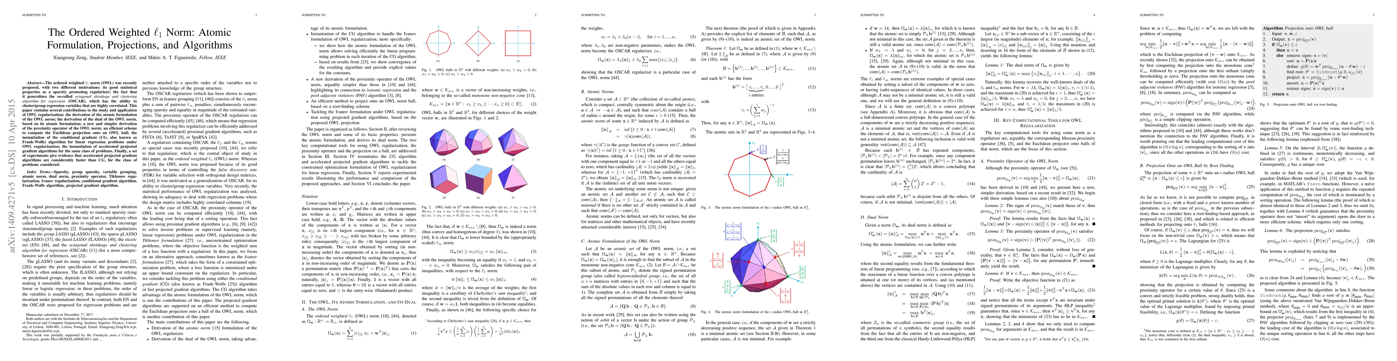 This paper introduces the ordered weighted $\ell_1$ norm (OWL) regularization, deriving its atomic formulation and dual, simplifying its proximity operator, and presenting efficient algorithms for its application, including accelerated projected gradient methods that outperform conditional gradient algorithms in linear regression.
