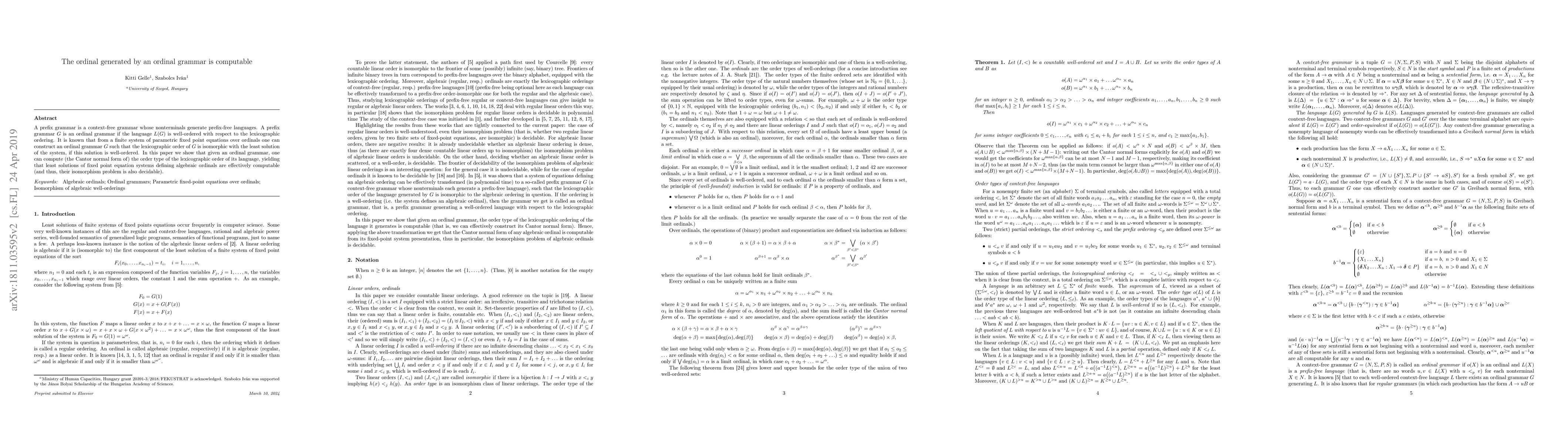 A prefix grammar is a context-free grammar whose nonterminals generate prefix-free languages. A prefix grammar $G$ is an ordinal grammar if the language $L(G)$ is well-ordered with respect to the lexicographic ordering. It is known that from a finite system of parametric fixed point equations one can construct an ordinal grammar $G$ such that the lexicographic order of $G$ is isomorphic with the least solution of the system, if this solution is well-ordered. In this paper we show that given an ordinal grammar, one can compute (the Cantor normal form of) the order type of the lexicographic order of its language, yielding that least solutions of fixed point equation systems defining algebraic ordinals are effectively computable (and thus, their isomorphism problem is also decidable).
