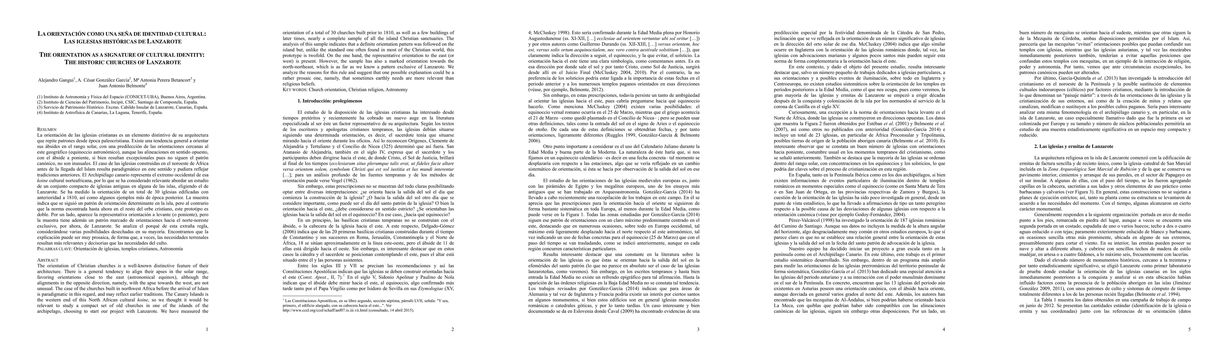 This study analyzes the orientation of historic churches in Lanzarote, Canary Islands, finding a unique two-fold pattern that deviates from the typical east-west alignment, with a significant north-northeast orientation.