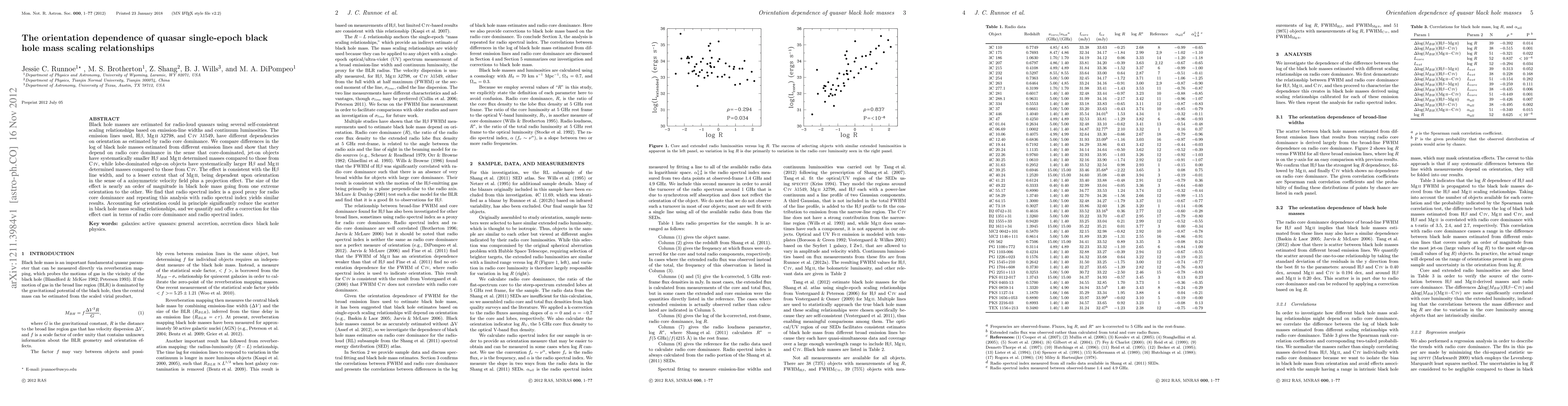 This paper investigates how the orientation of radio-loud quasars affects the estimation of black hole masses using different emission lines. It finds that quasars with dominant radio jets show smaller masses when estimated via H-beta and Mg II lines, compared to those estimated via C IV, suggesting orientation-dependent effects on emission line widths.