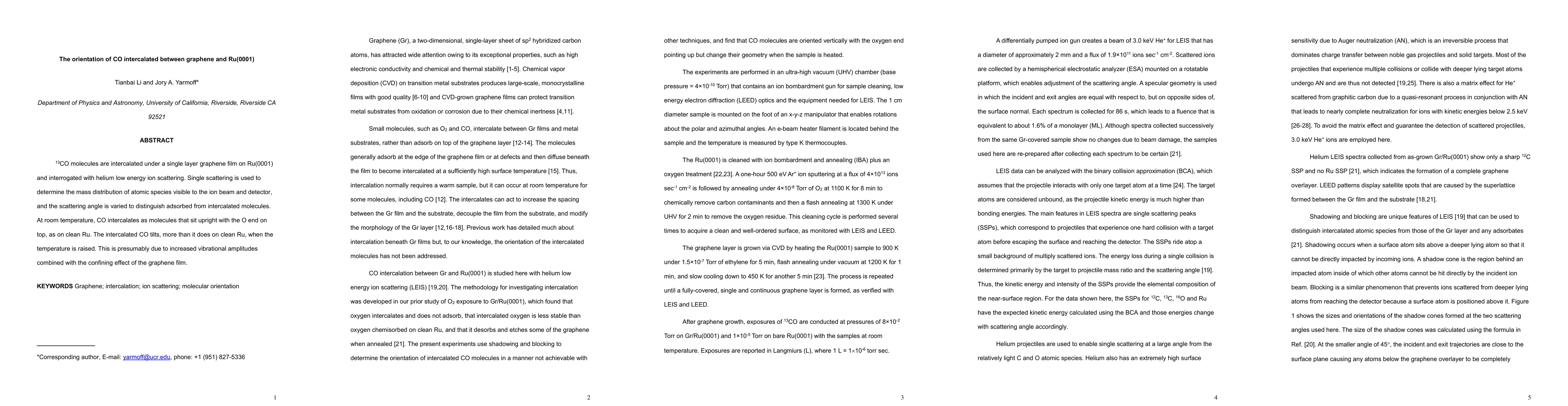 Summary: Intercalated $^{13}$CO molecules between graphene and Ru(0001) are found to be upright at room temperature, similar to clean Ru, but tilt more with increasing temperature due to enhanced vibrational motion and confinement by graphene. This behavior is revealed through helium low energy ion scattering.