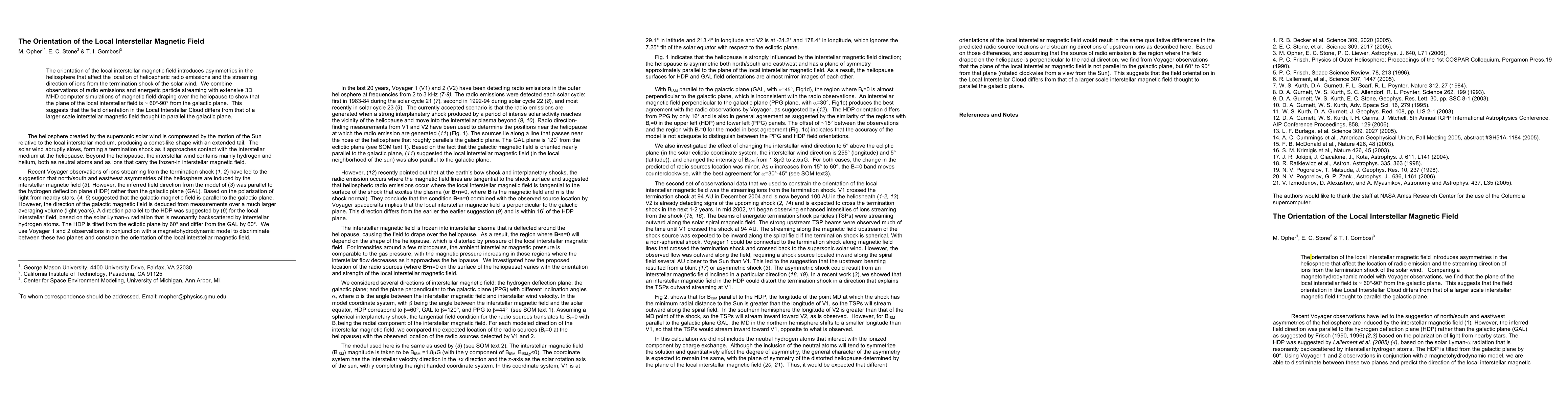 This study combines radio emission observations, energetic particle streaming data, and 3D MHD simulations to determine the orientation of the local interstellar magnetic field, revealing it is ~60-90 degrees from the galactic plane. This suggests a significant difference in orientation compared to larger scale interstellar magnetic fields.