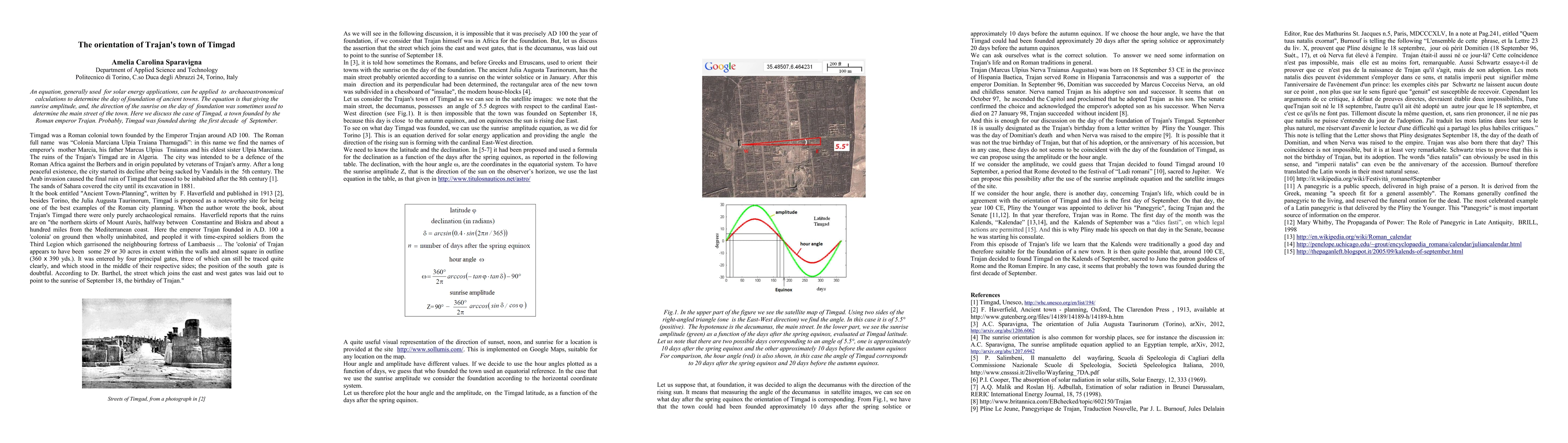 Summary: This paper applies an equation used for solar energy to archaeoastronomical calculations, determining the orientation of Trajan's town of Timgad, suggesting it was likely founded in the first decade of September based on sunrise direction.