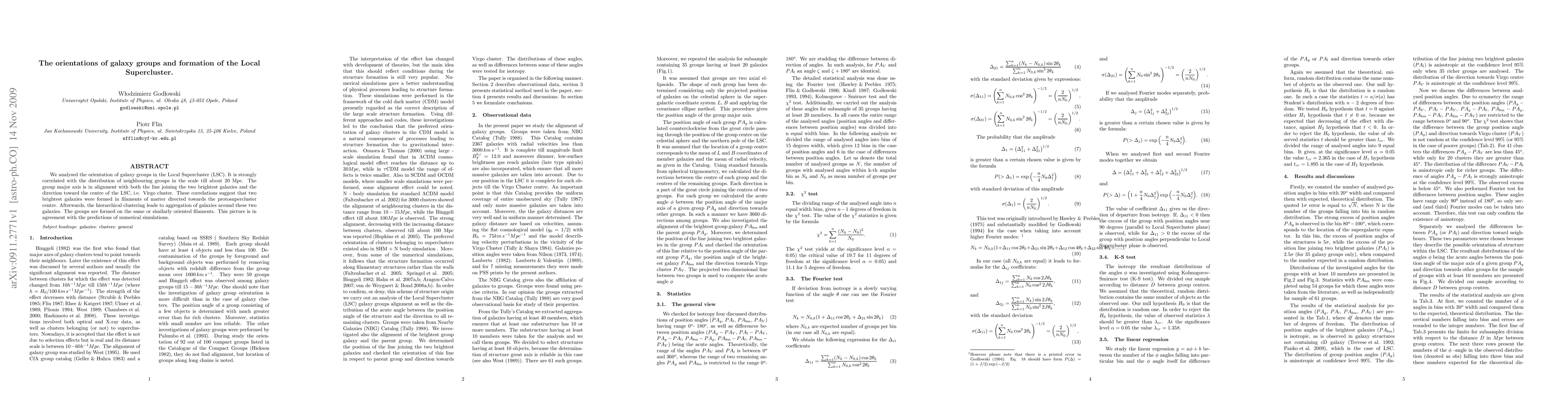 We analysed the orientation of galaxy groups in the Local Supercluster (LSC). It is strongly correlated with the distribution of neighbouring groups in the scale till about 20 Mpc. The group major axis is in alignment with both the line joining the two brightest galaxies and the direction toward the centre of the LSC, i.e. Virgo cluster. These correlations suggest that two brightest galaxies were formed in filaments of matter directed towards the protosupercluster centre. Afterwards, the hierarchical clustering leads to aggregation of galaxies around these two galaxies. The groups are formed on the same or similarly oriented filaments. This picture is in agreement with the predictions of numerical simulations.